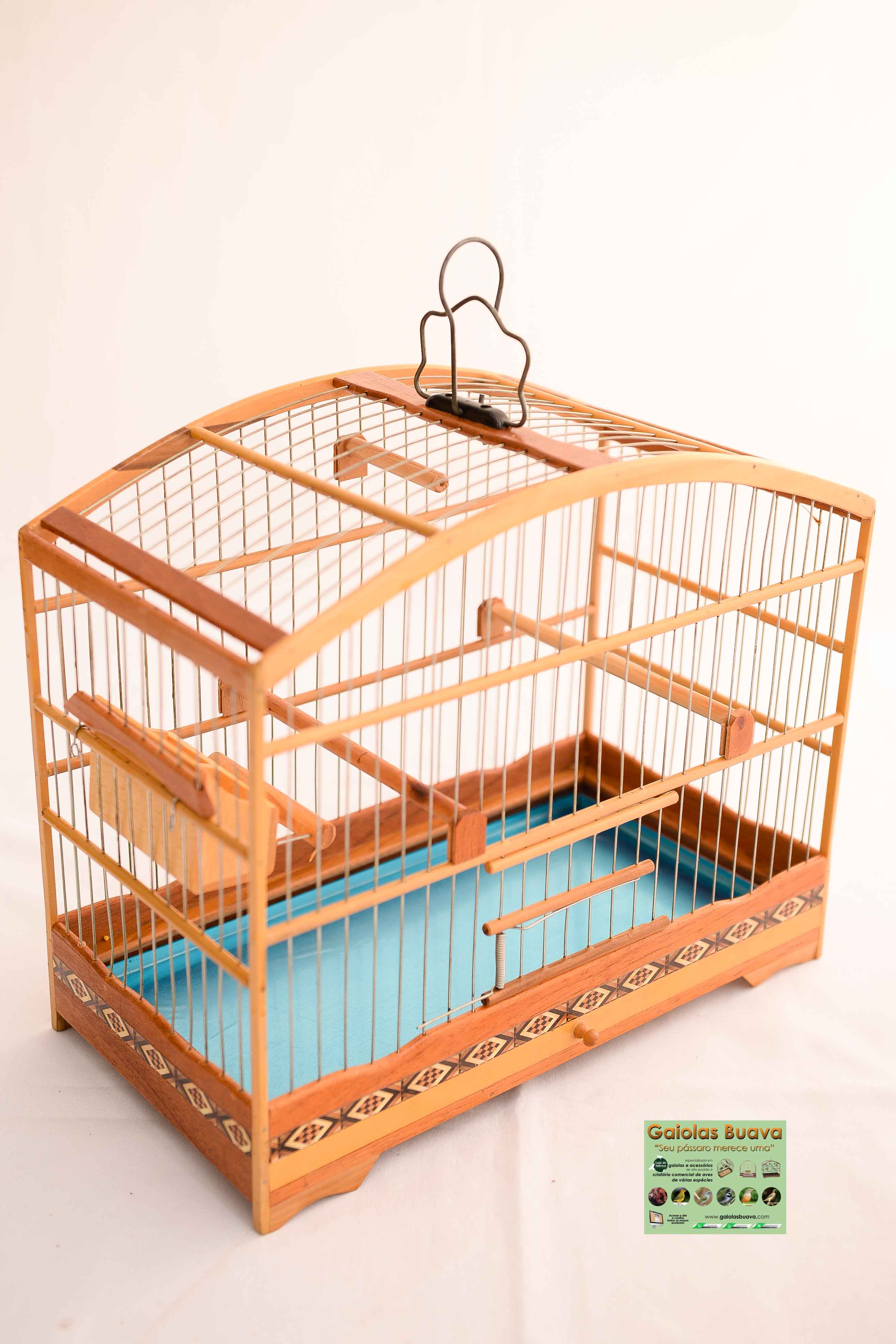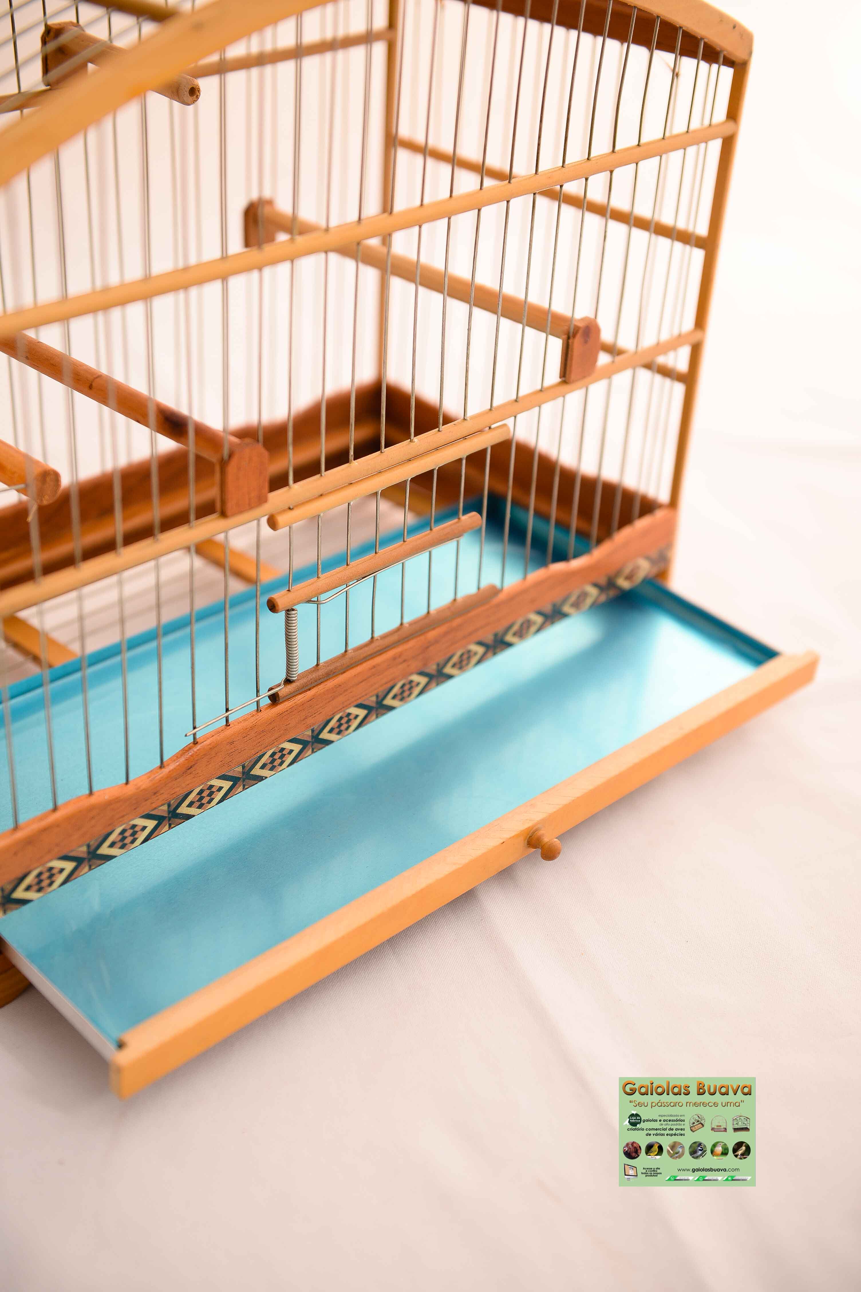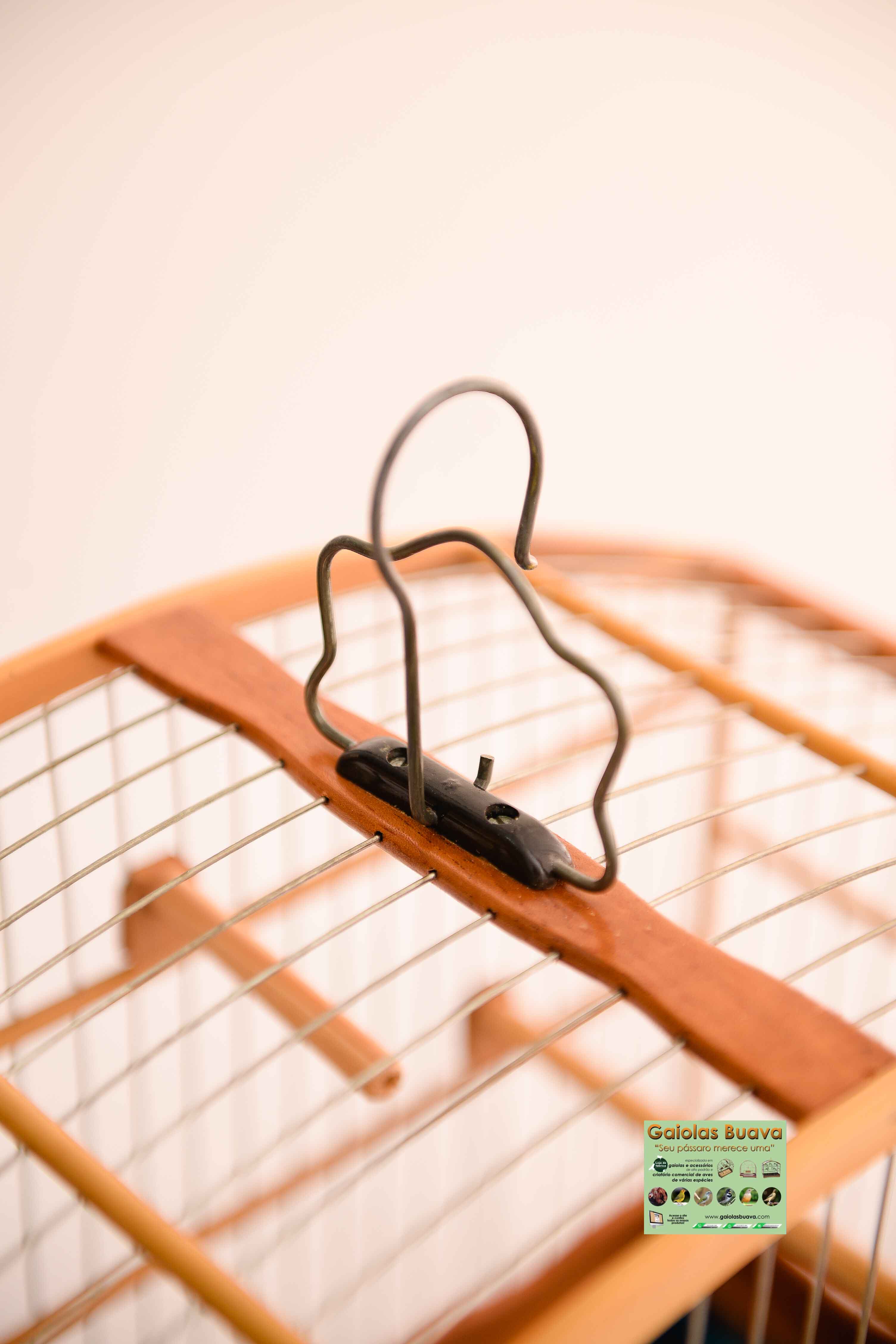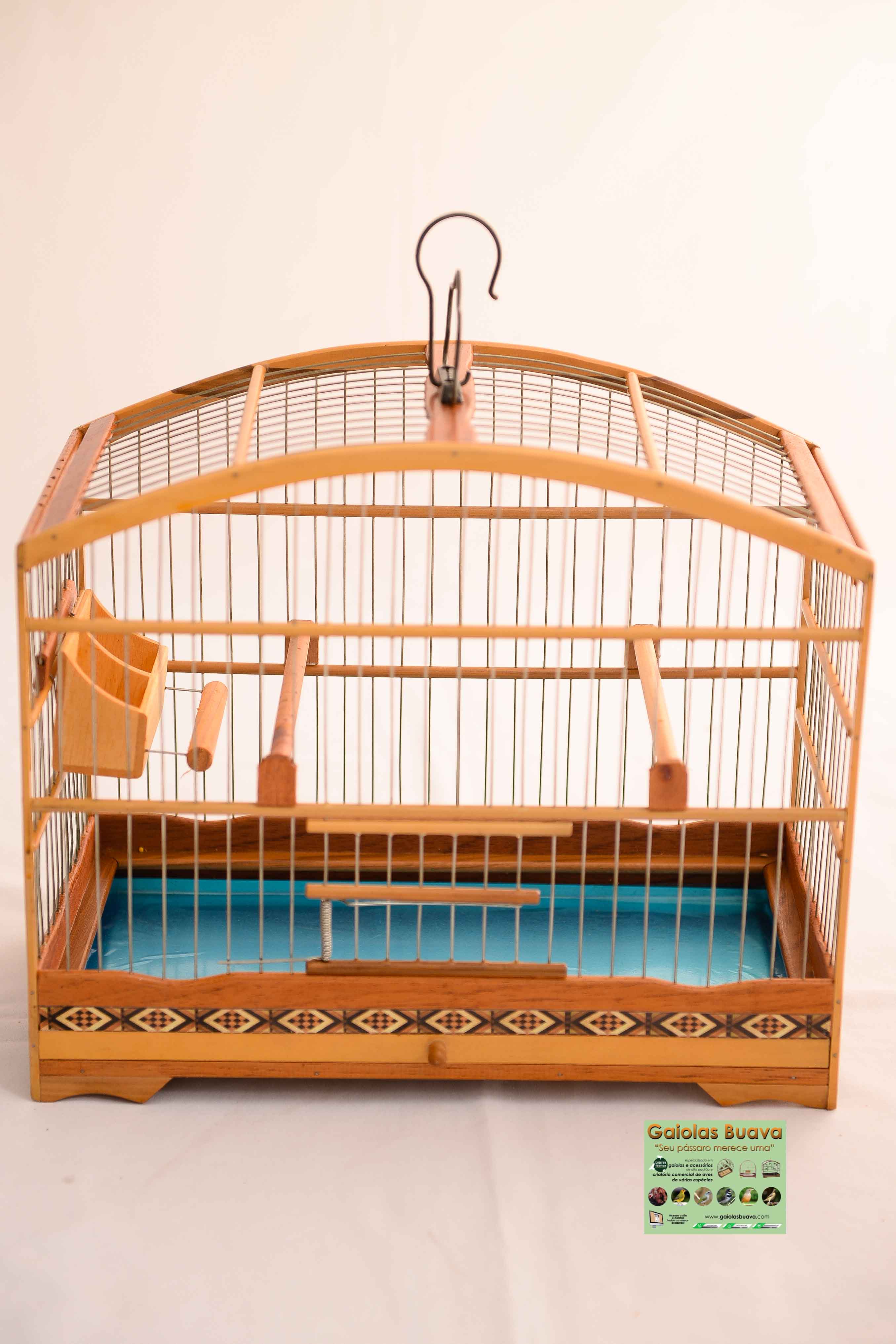 Delicada gaiola de coleiro BT com detalhes de marchetaria adesivada, gaiola feita de madeira castelo e cedro escuro, madeiras nobres de muita qualidade. A gaiola é de arame com malha fina e nela acompanha 1 cocho alto removível com poleiro, 2 poleiros com presilhas, 1 dorminhoco com presilha, um passador lateral com abertura na vertical, 1 porta de mola e alça/gancho de duas funções. O fundo da gaiola é de alumínio e a abertura é frontal. Gaiola bastante resistente e durável para seu coleiro.