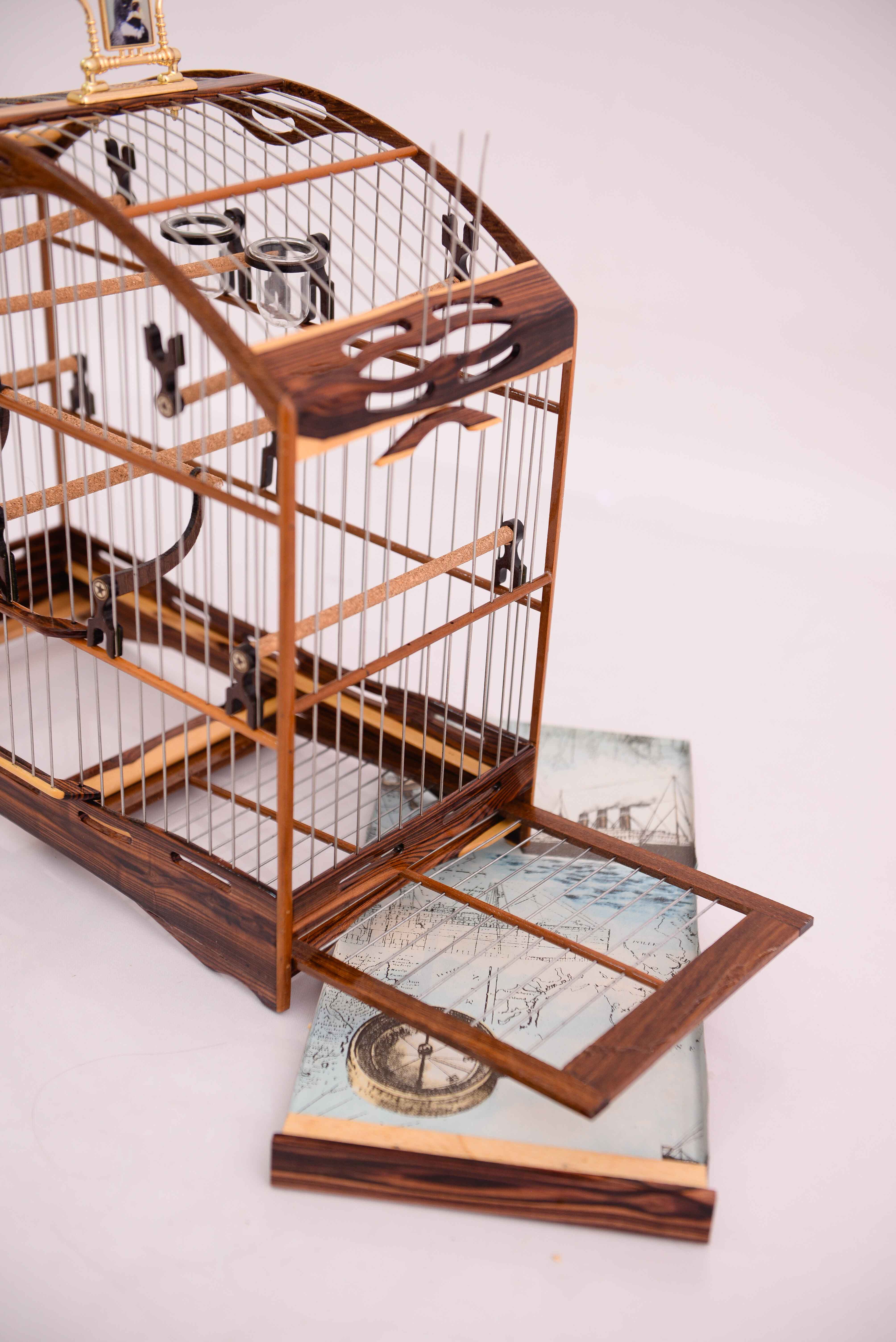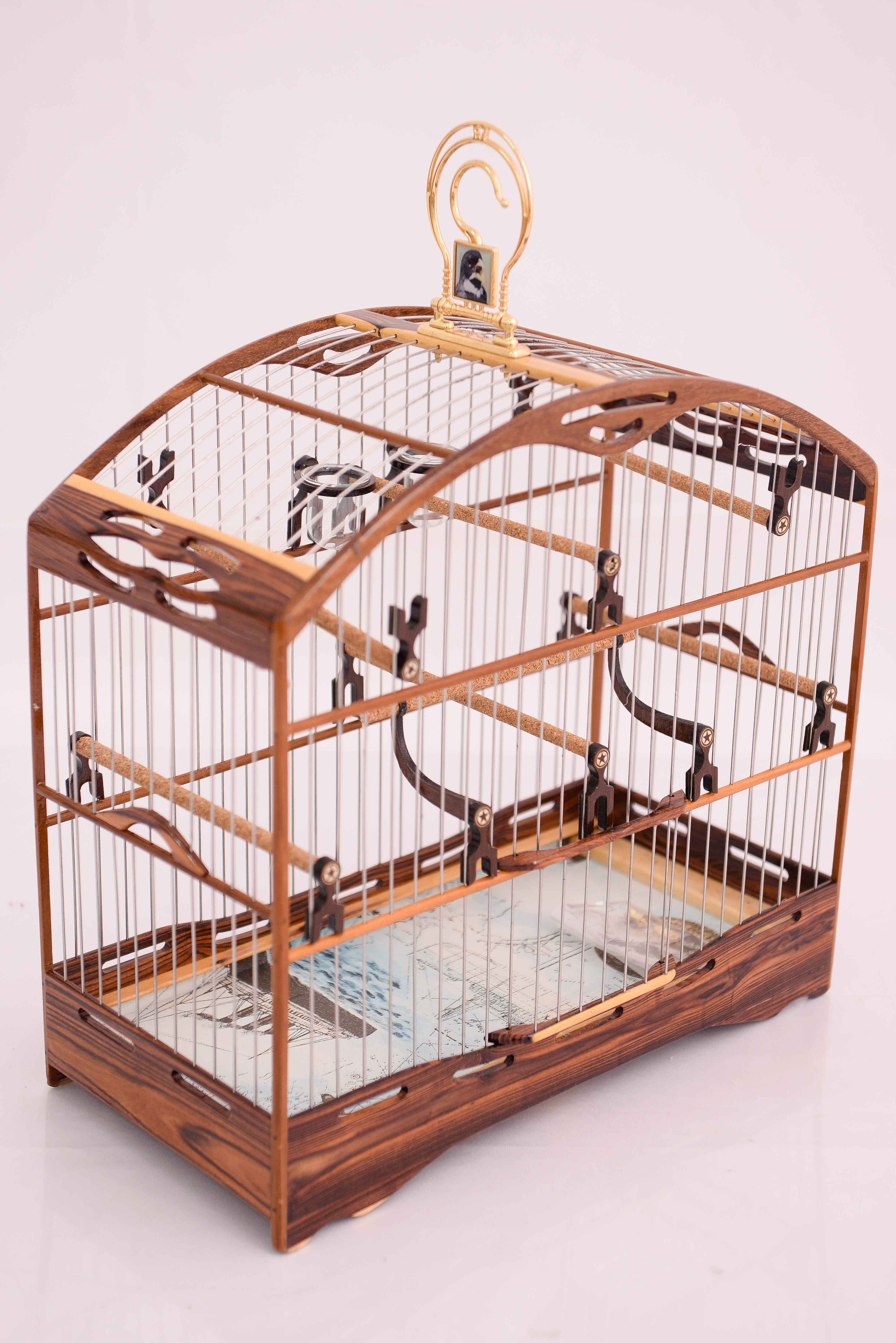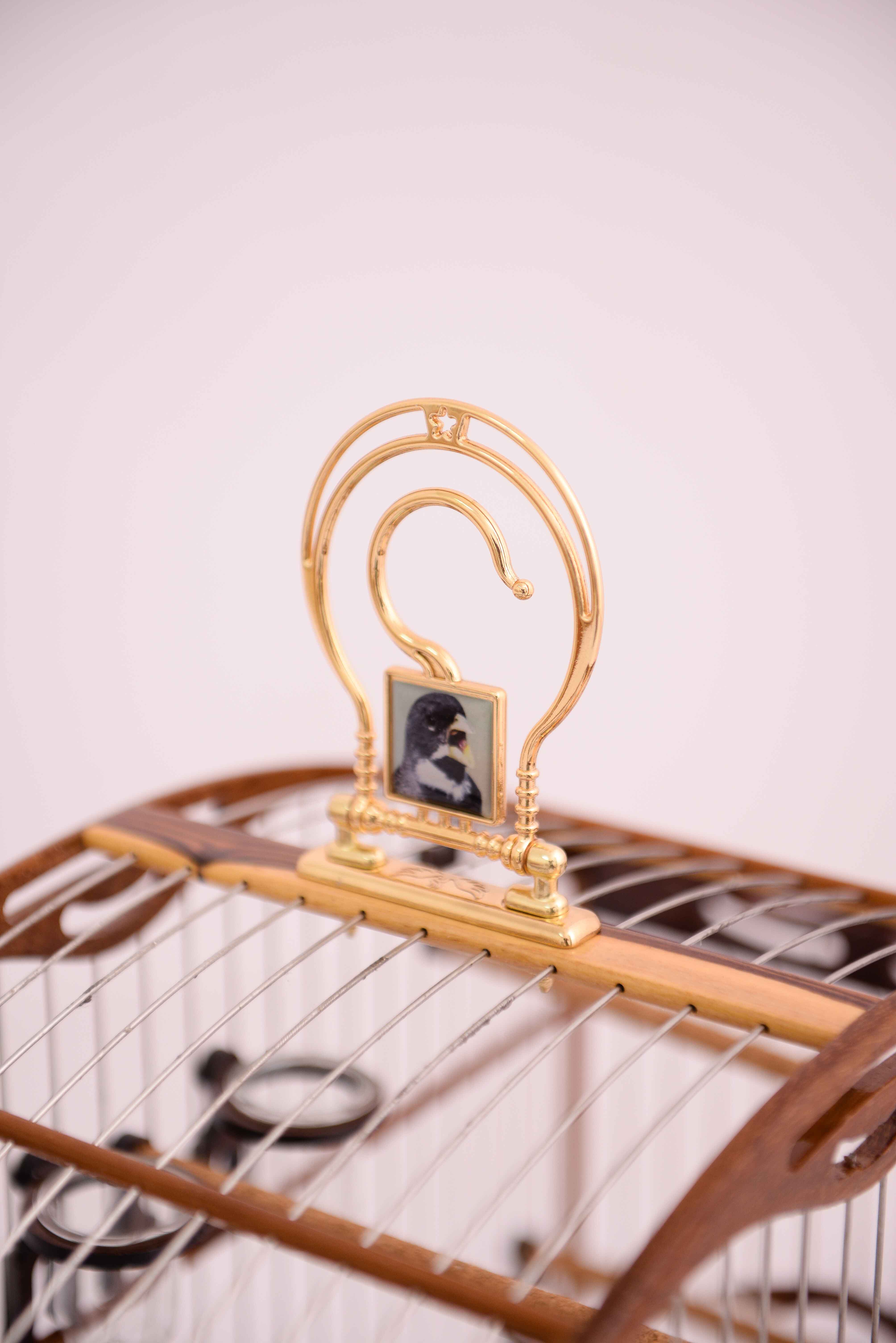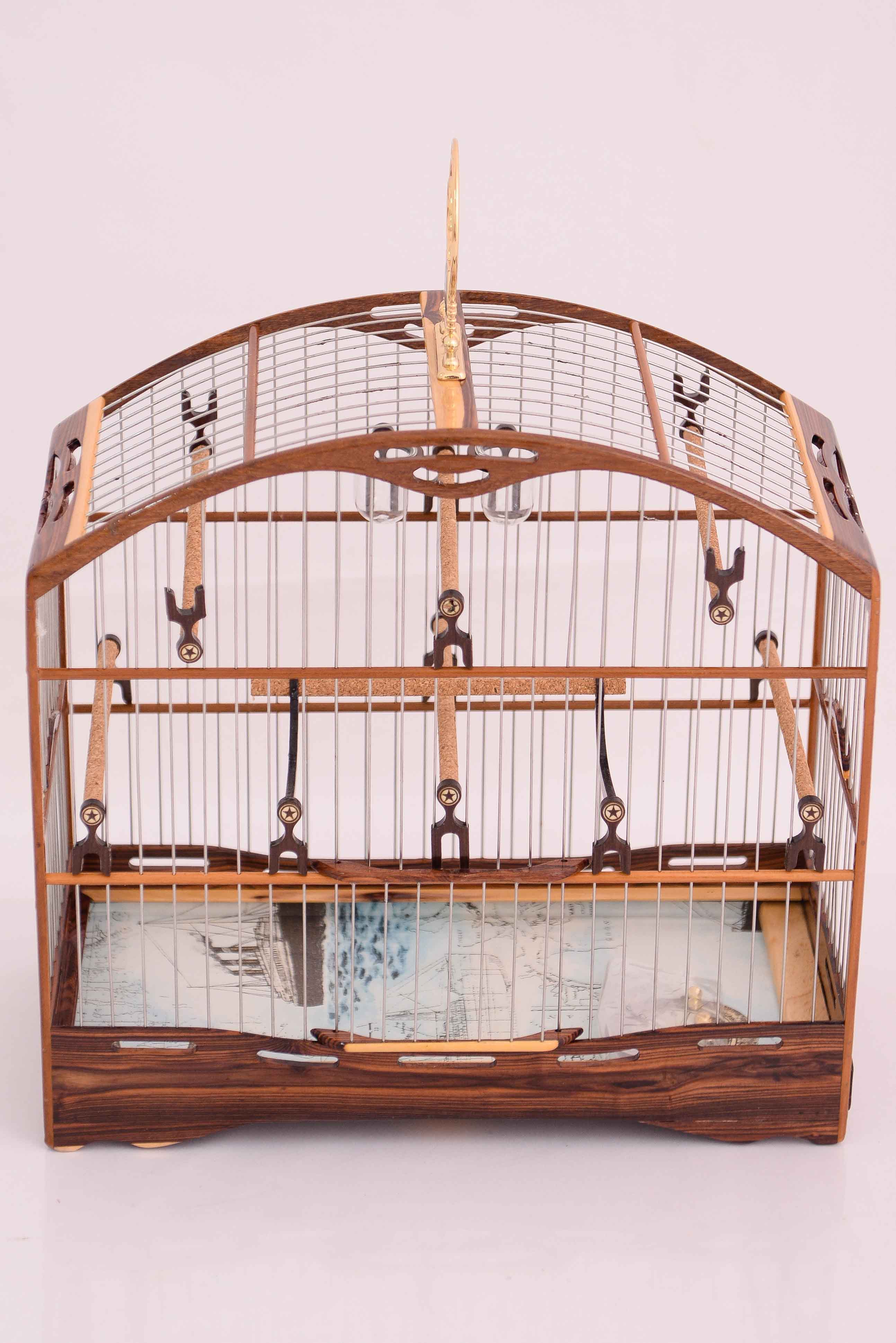 Gaiola de luxo para coleiros, feita de madeira jacarandá tecida em malha fina de inox.