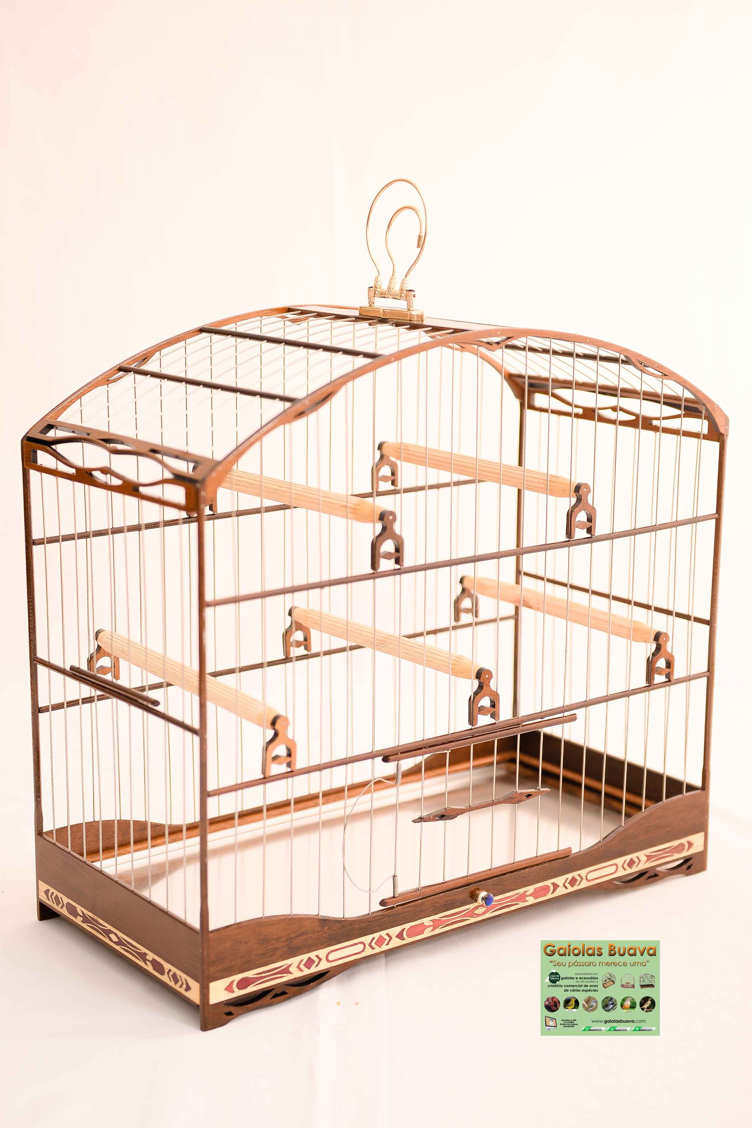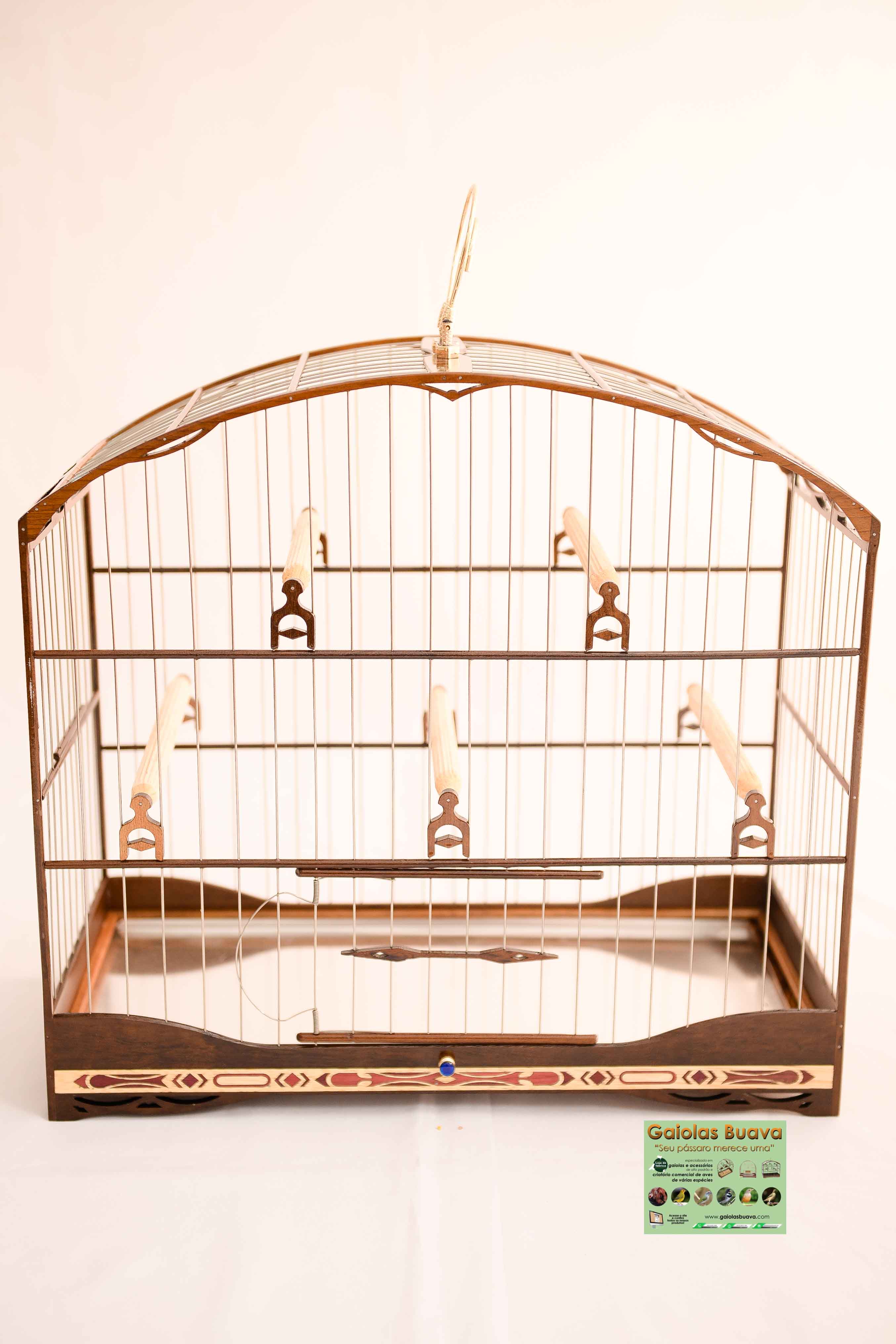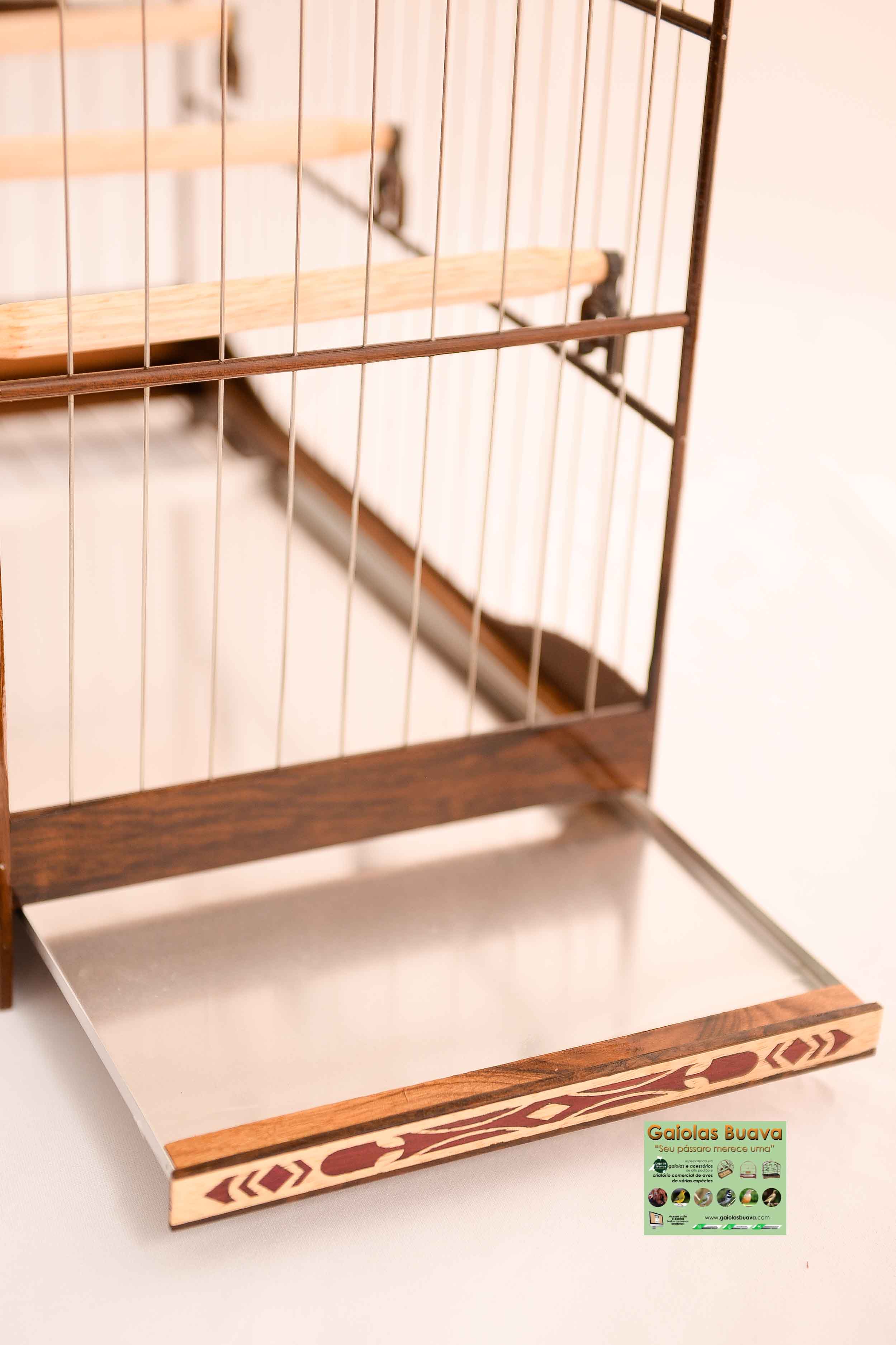 Gaiola imbuia de trinca-ferro ou pássaros do mesmo porte, com muitos detalhes, e desenhos marchetados, contém uma saída lateral com porta de guilhotina e uma porta central de mola. Além disso a gaiola acompanha 5(cinco) poleiros com presilha, um gancho de duas funções de luxo e um puxador central de luxo. Fundo da gaiola removível pela lateral com chapa de alumínio