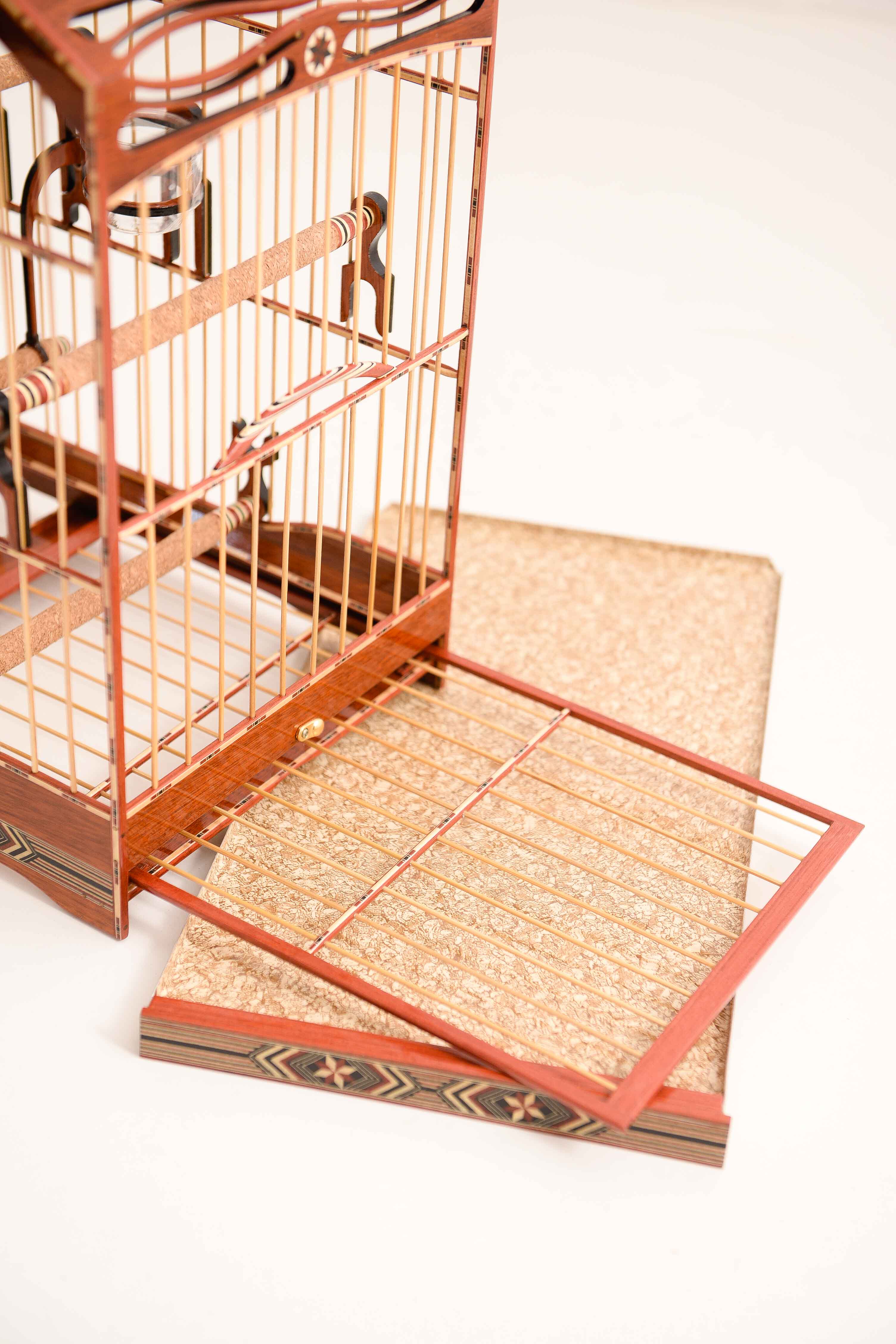 Belíssima gaiola de luxo em madeira vermelha em malha larga tecida em fibra clara. Em sua base há detalhes marchetados, 1(um) puxador de luxo na cor dourada, sua bandeja é toda envelopada com papel adesivo e envernizada, com saída lateral, a bandeja tem uma trava de luxo. Seu fundo é totalmente removível, em cada lateral há 1(um) passador lateral de porta estilo guilhotina com abertura vertical, a porta principal é de estilo guilhotina com abertura vertical, seu teto é todo trabalhado com recortes e tem 1(um) gancho dourado de luxo com duas funções. Os acessórios que acompanham a gaiola são 2(dois) porta vitamina de luxo e 5(cinco) poleiros de luxo com presilha estilo ferradura.