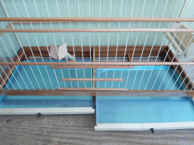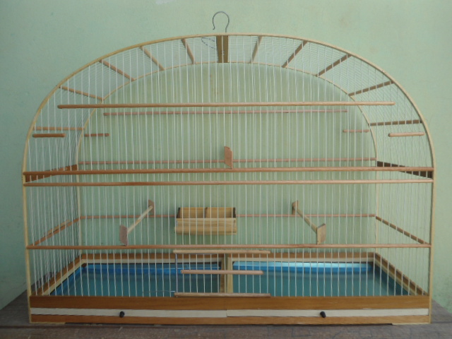 GAIOLA FEITA EM MADEIRAS NOBRES, TECIDA EM FIBRA, FUNDO DE ALUMINIO REFORÇADO COM RETIRADA FRONTAL DIVIDIDO EM DUAS PARTES, MALHA LARGA, COCHO ALTO COM POLEIRO, VERNIS PU, COM PASSADOR LATERAL, COM ÓTIMO ACABAMENTO.MEDIDAS: ALTURA: 58 CUMPRIMENTO: 82 LARGURA: 25 ACOMPANHA: 3 PULEIROS 1 COCHO ALTO