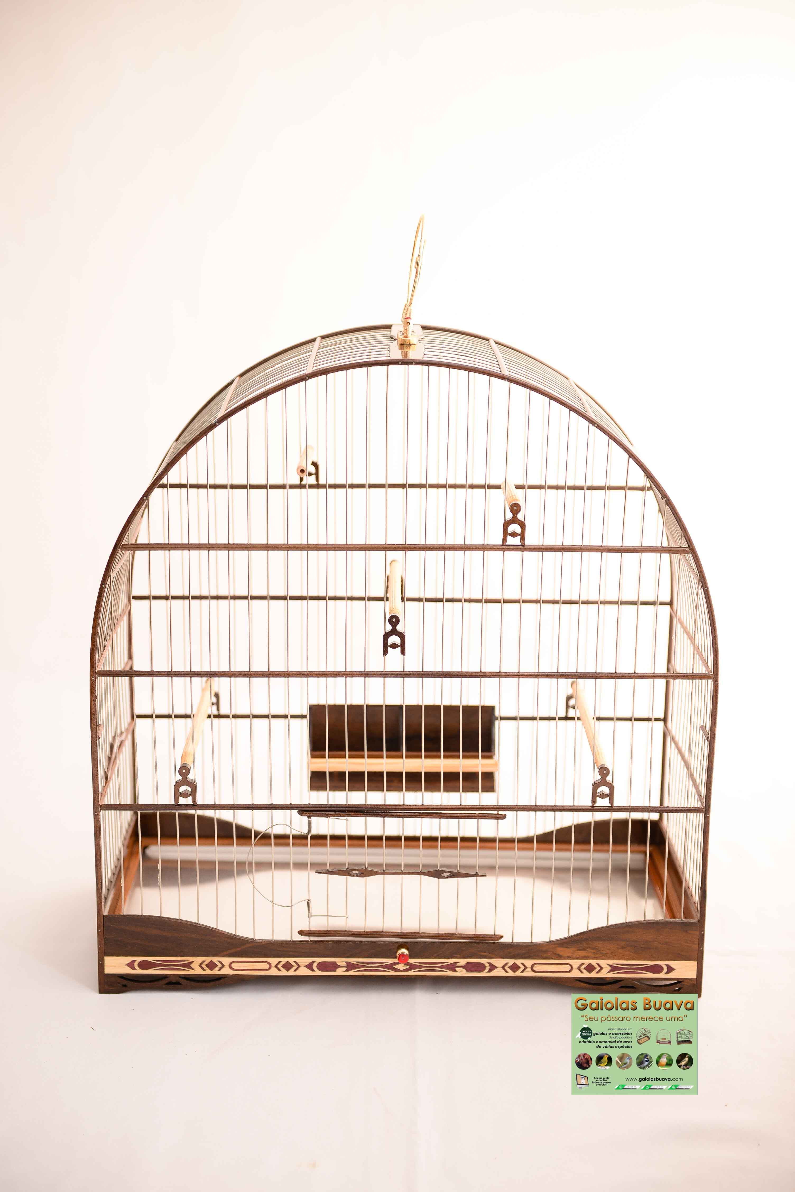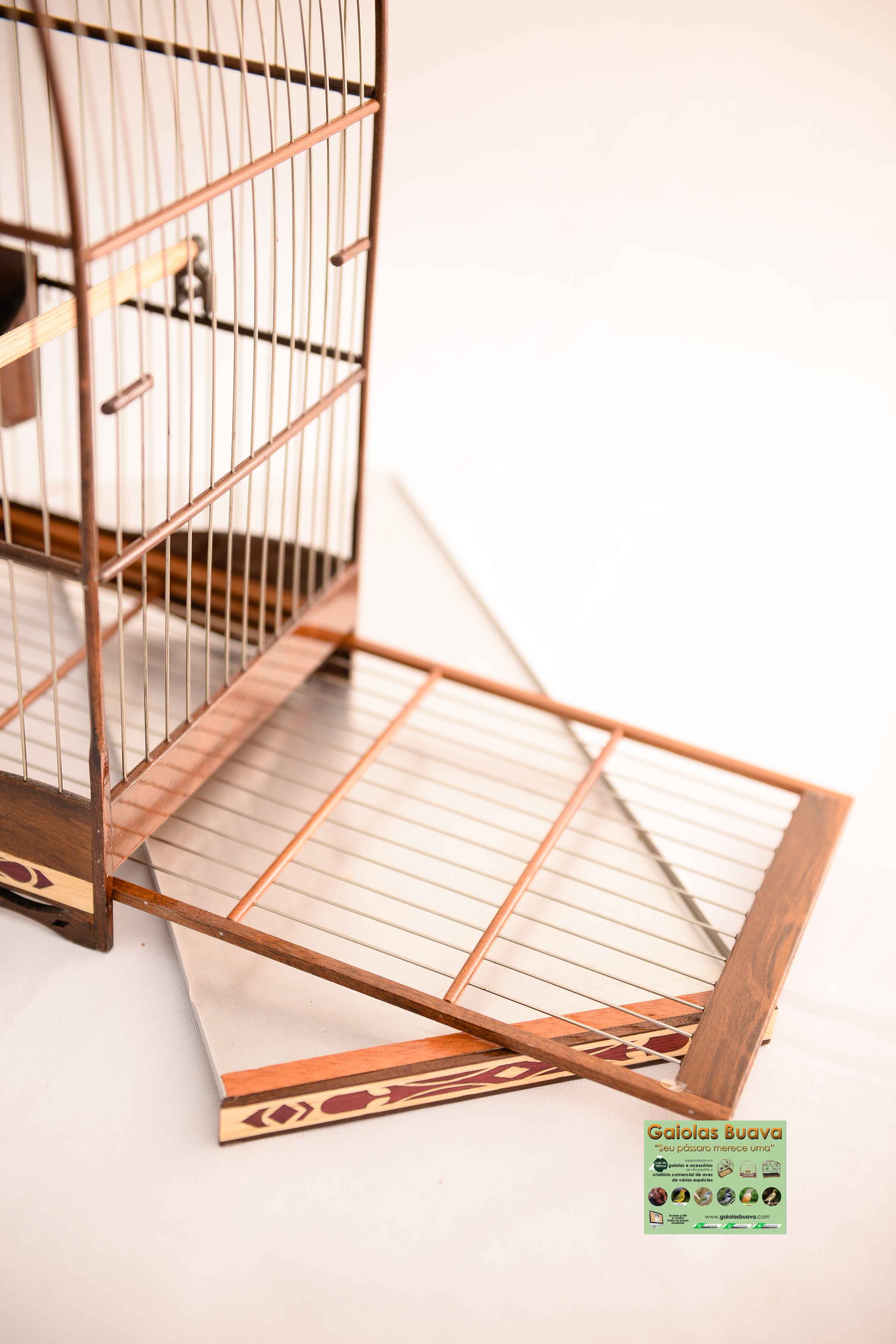 Belíssima gaiola imbuia de madeira preta com detalhes de marchetaria e puxador de luxo, com muitos detalhes e pés totalmente trabalhados, a gaiola contém presilhas laterais para a colocação do choco em ambos os lados, contém um passador lateral com abertura em vertical, uma porta de mola, 3 poleiros com presilhas ferradura , 2 dorminhocos com presilhas ferradura, 1 cocho alto com poleiro e gancho de luxo. O fundo da gaiola tem saída lateral e sua grade de fundo é removível facilitando a limpeza e manuseio. Gaiola de malha fina