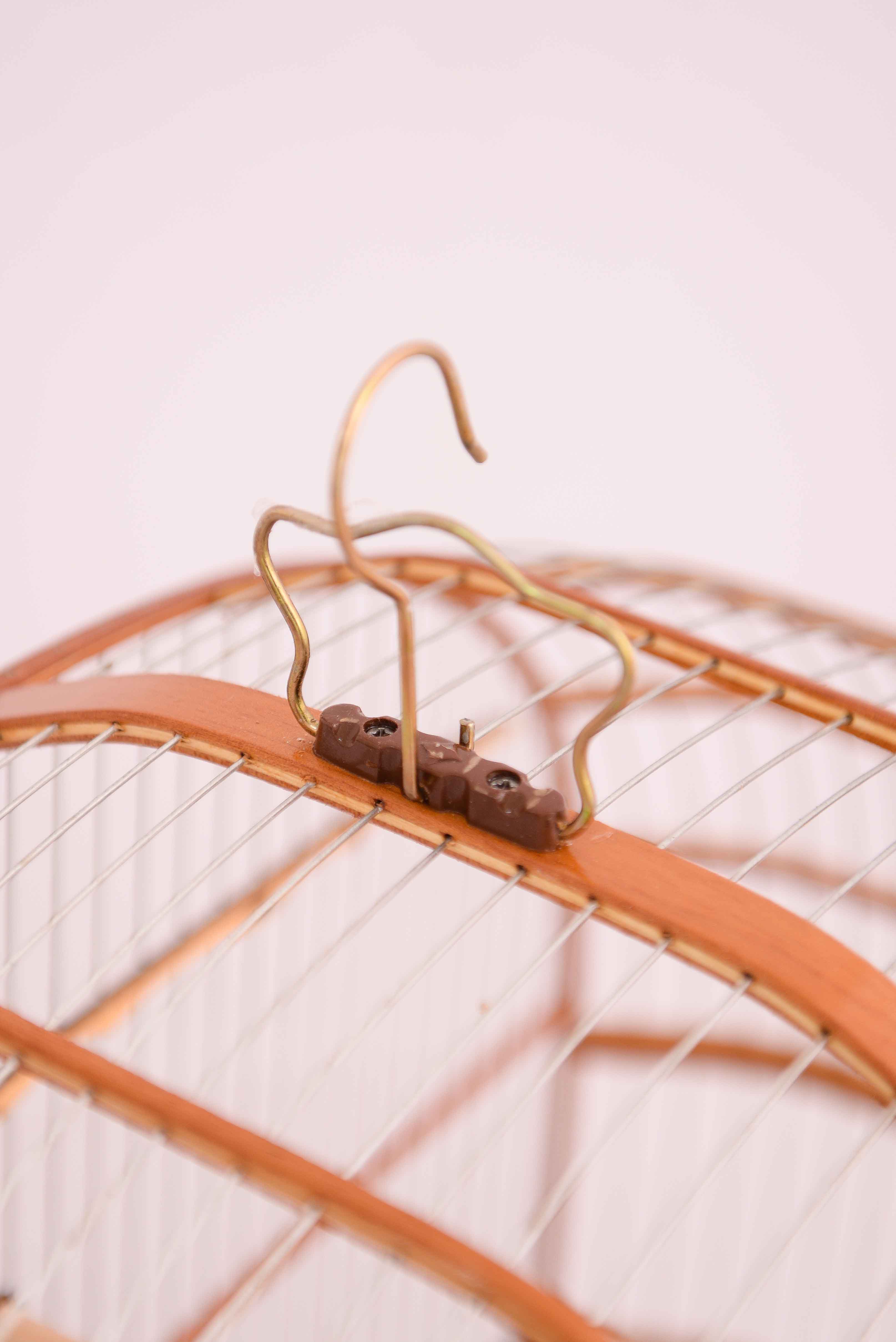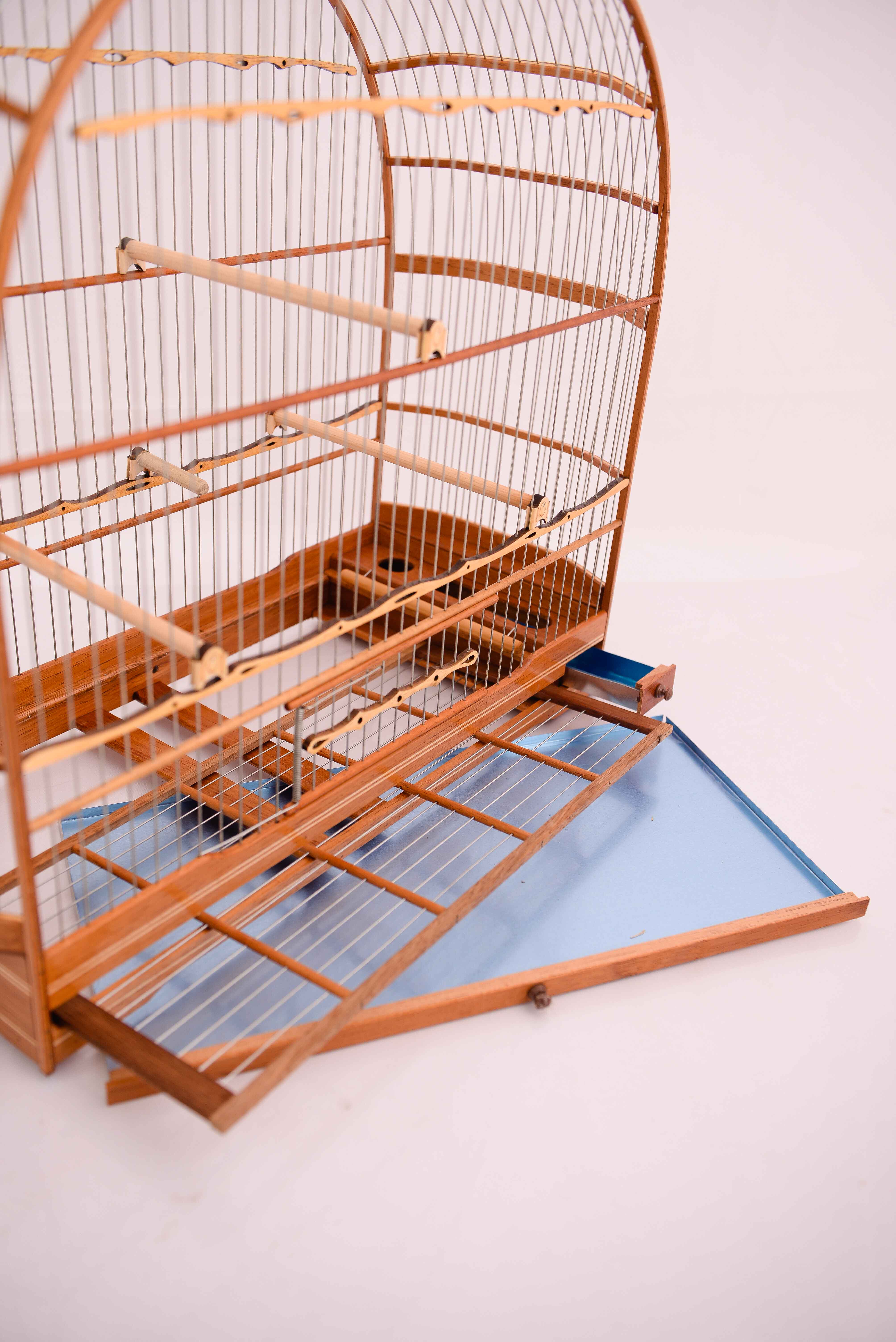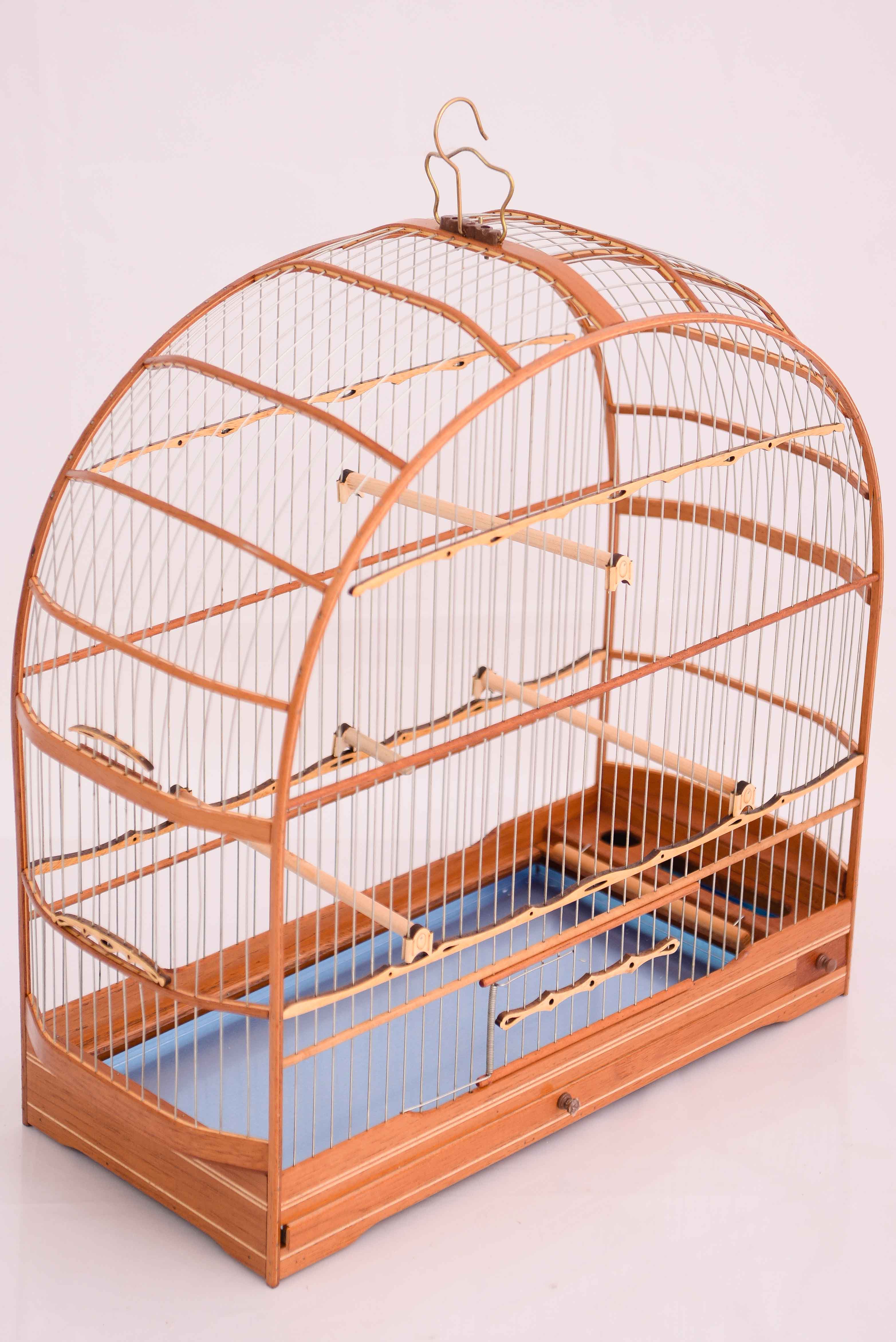 Gaiola de madeira de cedro com malha fina tecida em arame, a gaiola tem sua lateral totalmente abaulada, com filetes na sua base e recortes no seu corpo.