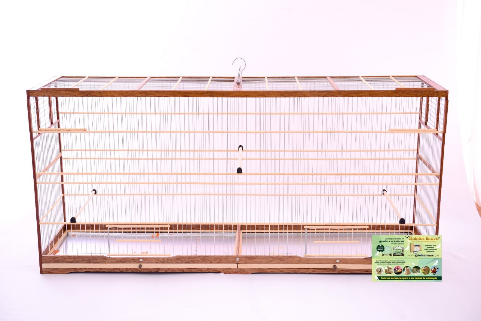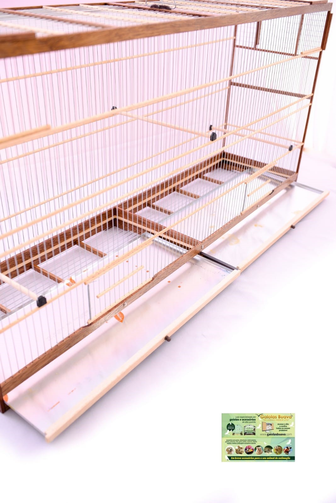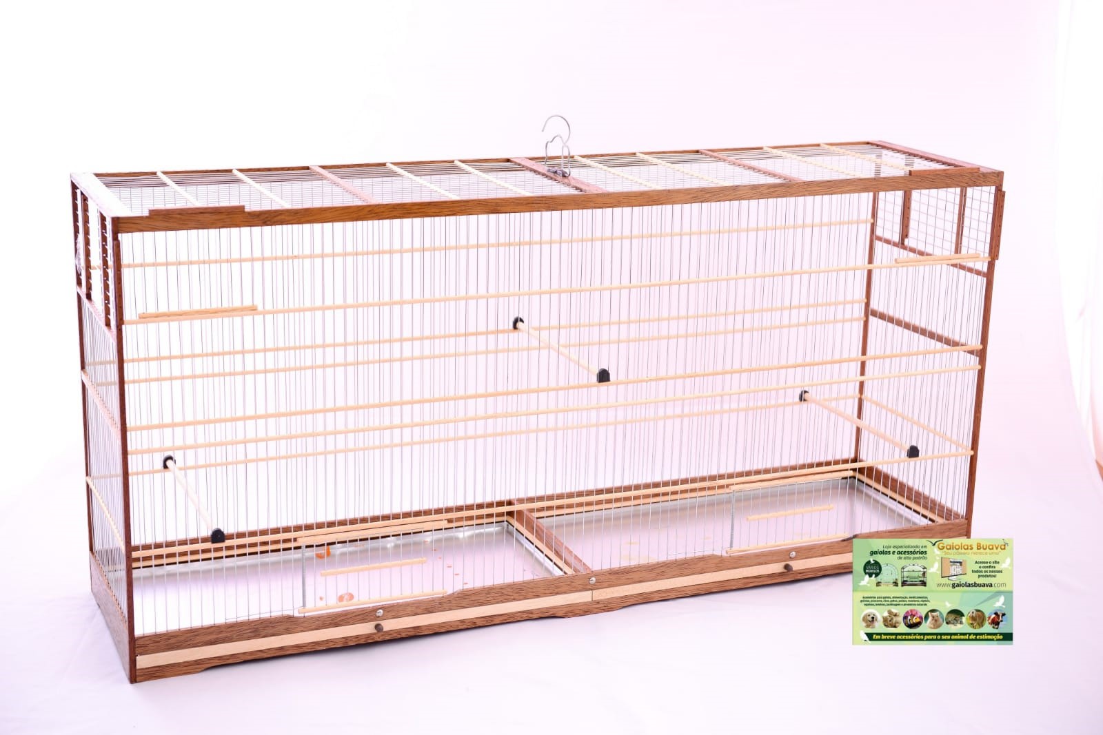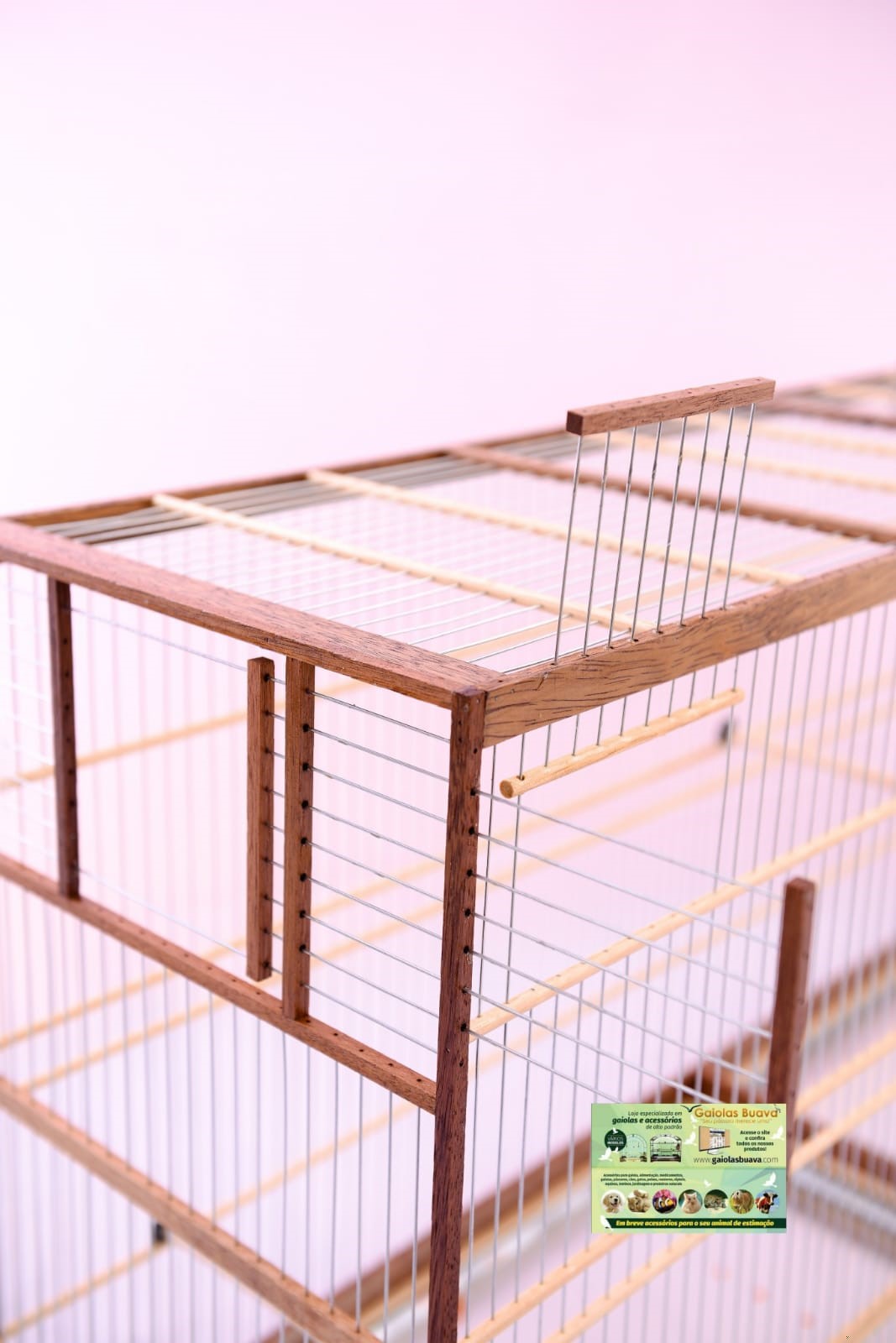 Voadeira mixta com madeira de cedro, envernizada com verniz PU, de malha fina tecida em arame. Na gaiola há 4(quatro) passadores laterais, 2(dois) com abertura frontal, e 2(dois) com abertura vertical, além de 2(duas) portas central de mola. também há 1(um) gancho de duas funções simples, e 3(três) poleiros com presilhas