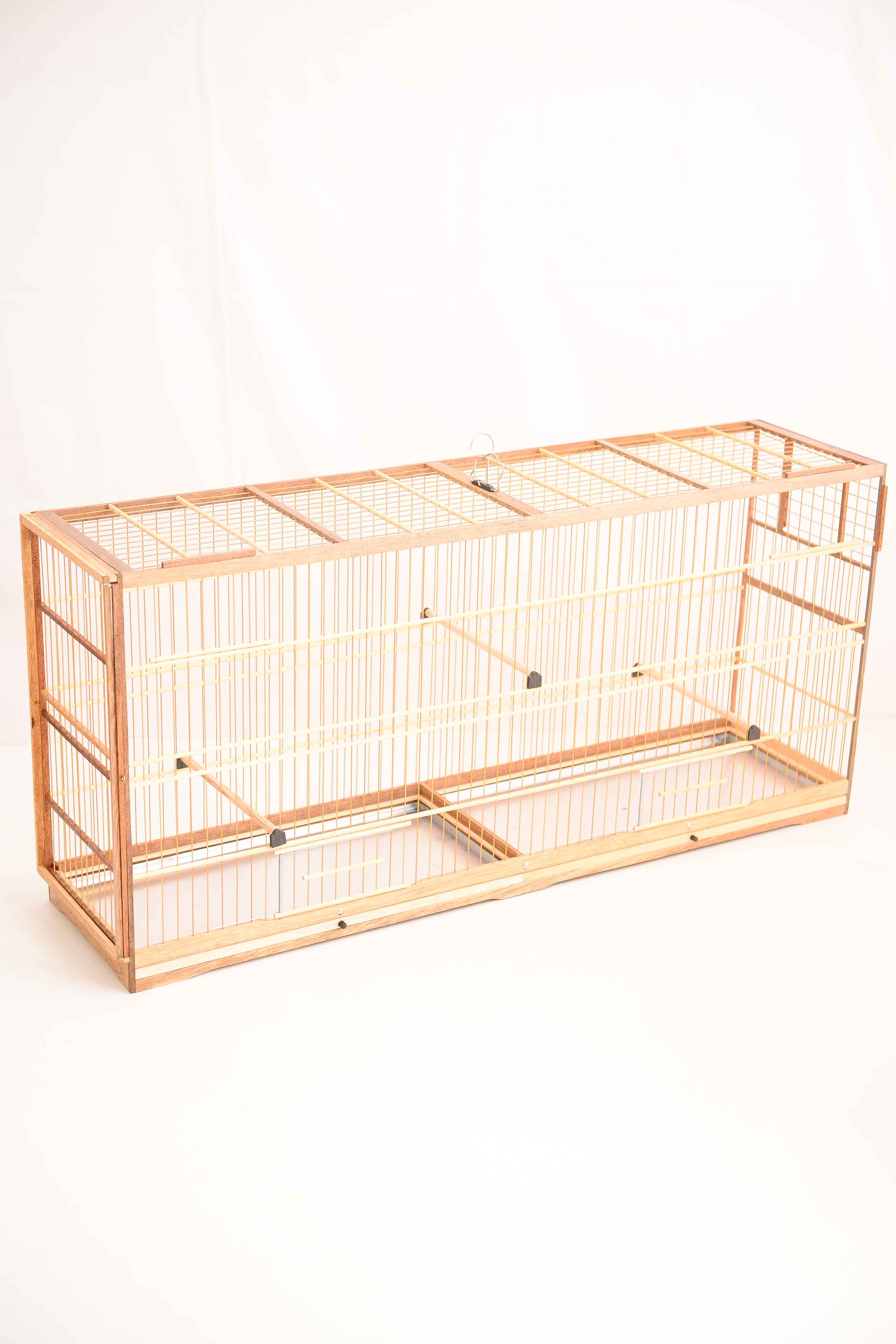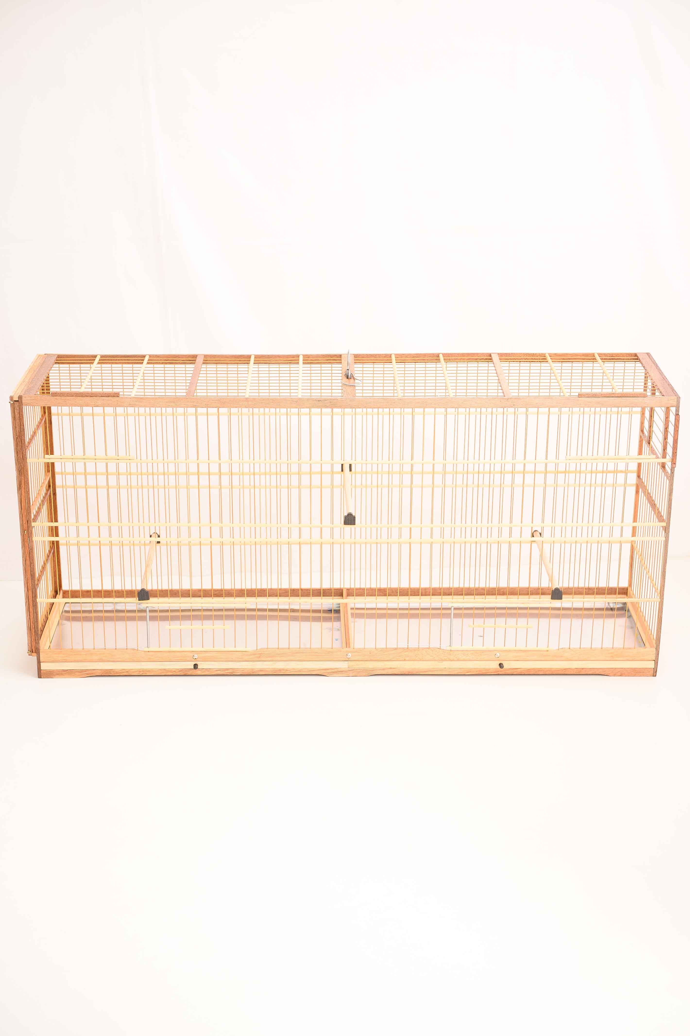 Voadeira de fibra em malha larga com acoplagem do lado esquerdo, na gaiola há 2(dois) passadores frontais de abertura vertical com porta estilo guilhotina, 2(duas) portas principais de mola, bandeja de fundo dividida em 2(duas) partes, ambas com abertura frontal, 2(dois) puxadores pitão de plástico, 3(três) poleiros com presilhas de plástico, 1(uma) alça de 2(duas) funções além dos pés trabalhados. A divisória de acoplagem tem ganchos que te assegura que a gaiola não abrirá sozinha.