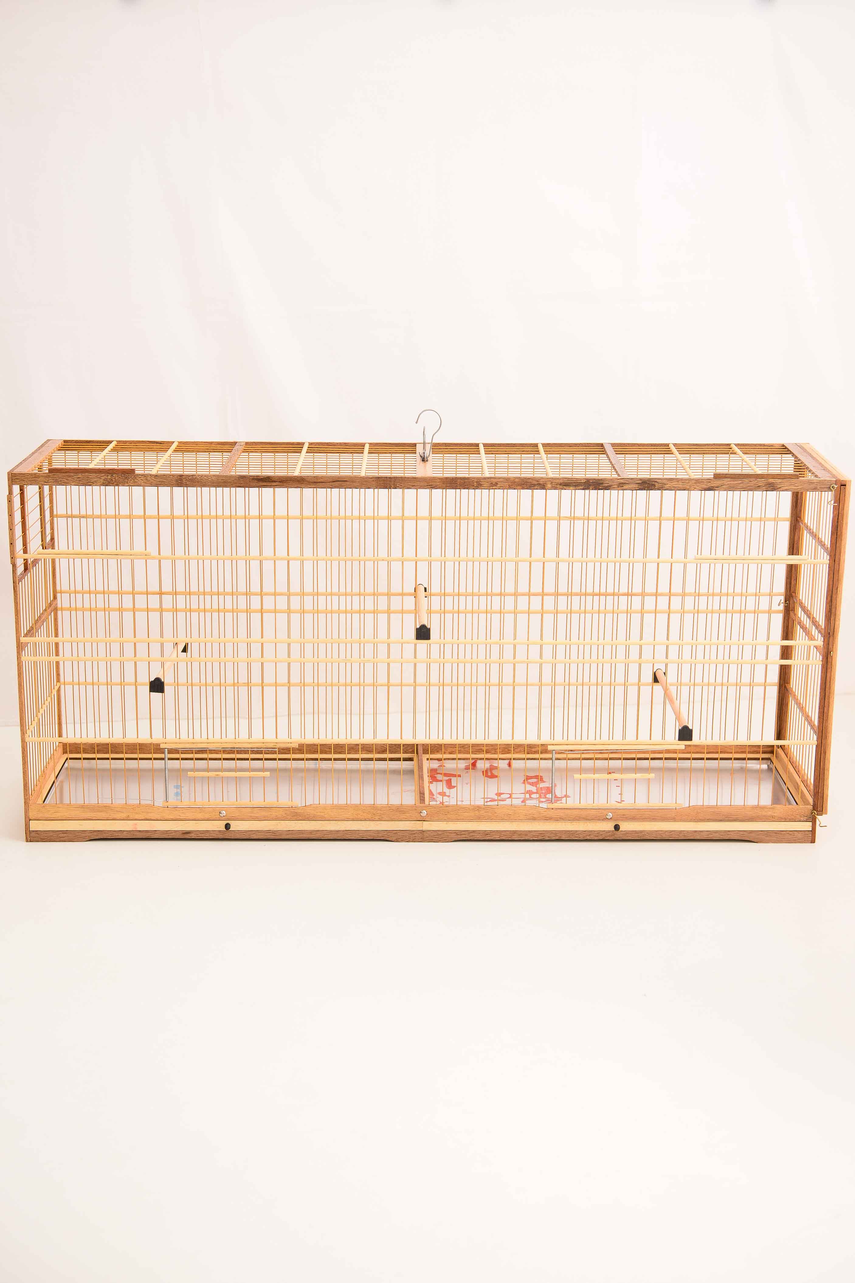 Voadeira de fibra em malha larga com acoplagem do lado direito, na gaiola há 2(dois) passadores frontais de abertura vertical com porta estilo guilhotina, 2(duas) portas principais de mola, bandeja de fundo dividida em 2(duas) partes, ambas com abertura frontal, 2(dois) puxadores pitão de plástico, 3(três) poleiros com presilhas de plástico, 1(uma) alça de 2(duas) funções além dos pés trabalhados. A divisória de acoplagem tem ganchos que te assegura que a gaiola não abrirá sozinha.