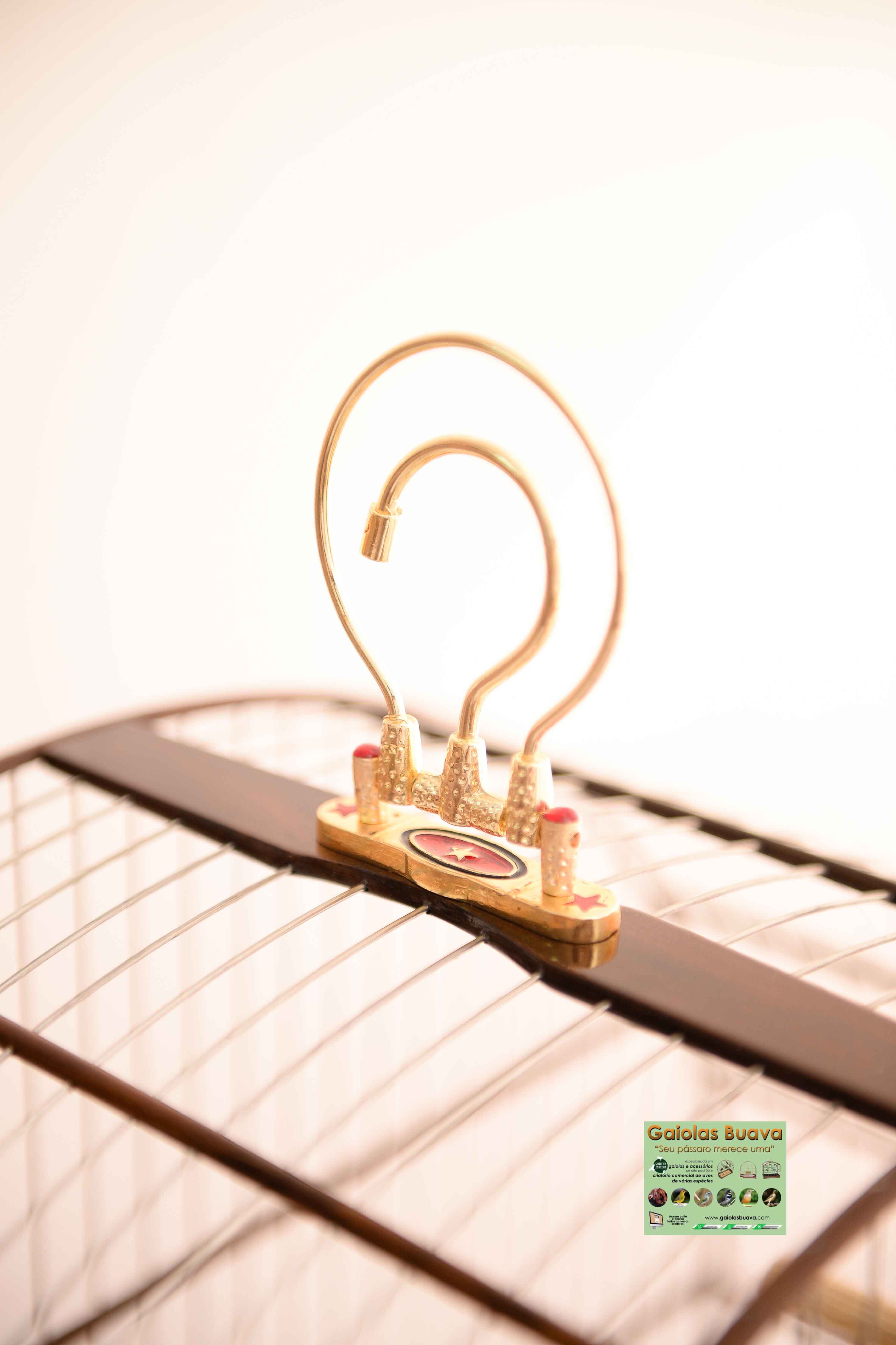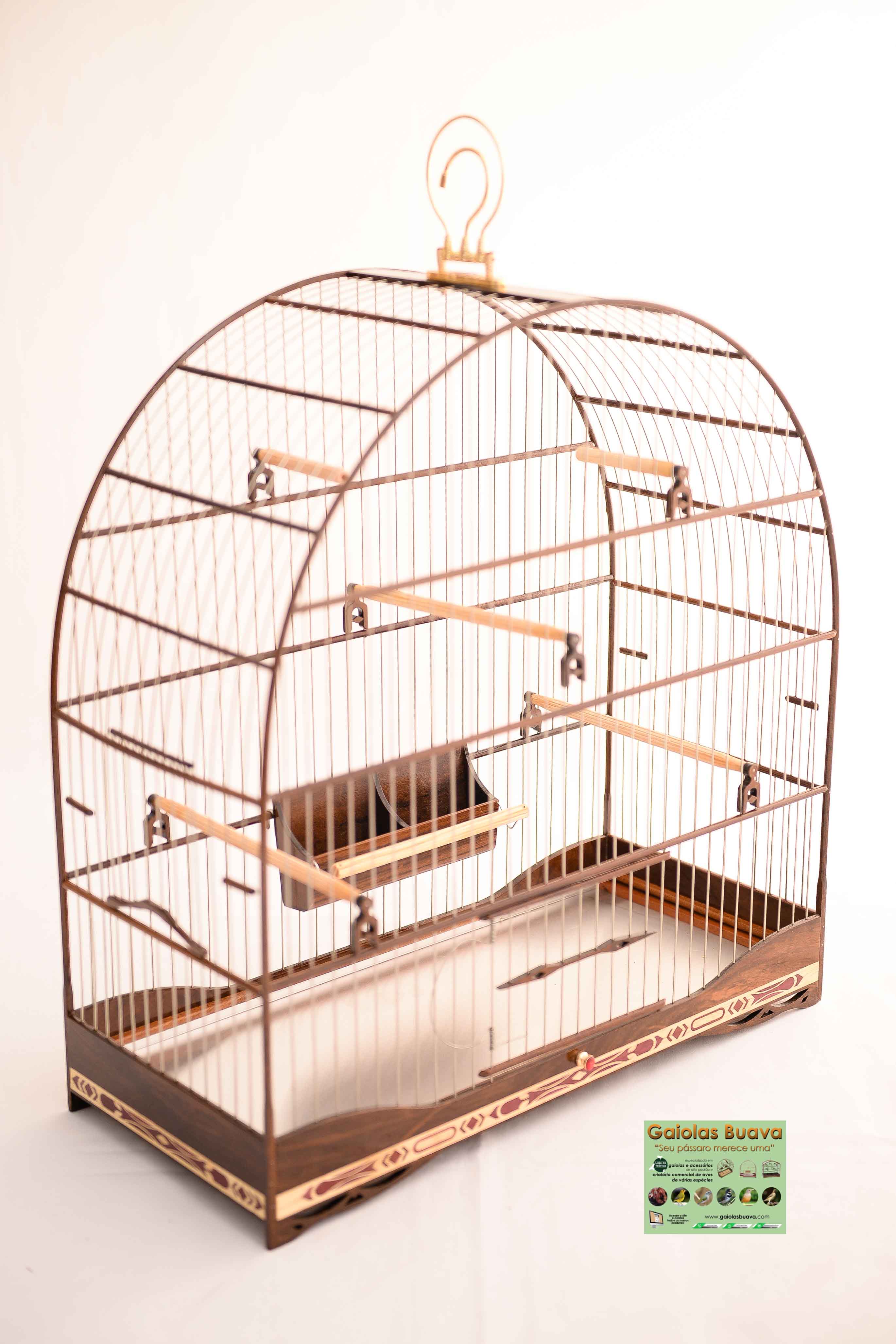 Belíssima gaiola imbuia de madeira preta com detalhes de marchetaria e puxador de luxo, com muitos detalhes e pés totalmente trabalhados, a gaiola contém presilhas laterais para a colocação do choco em ambos os lados, contém um passador lateral com abertura em vertical, uma porta de mola, 3 poleiros com presilhas ferradura , 2 dorminhocos com presilhas ferradura, 1 cocho alto com poleiro e gancho de luxo. O fundo da gaiola tem saída lateral e sua grade de fundo é removível facilitando a limpeza e manuseio. Gaiola de malha fina