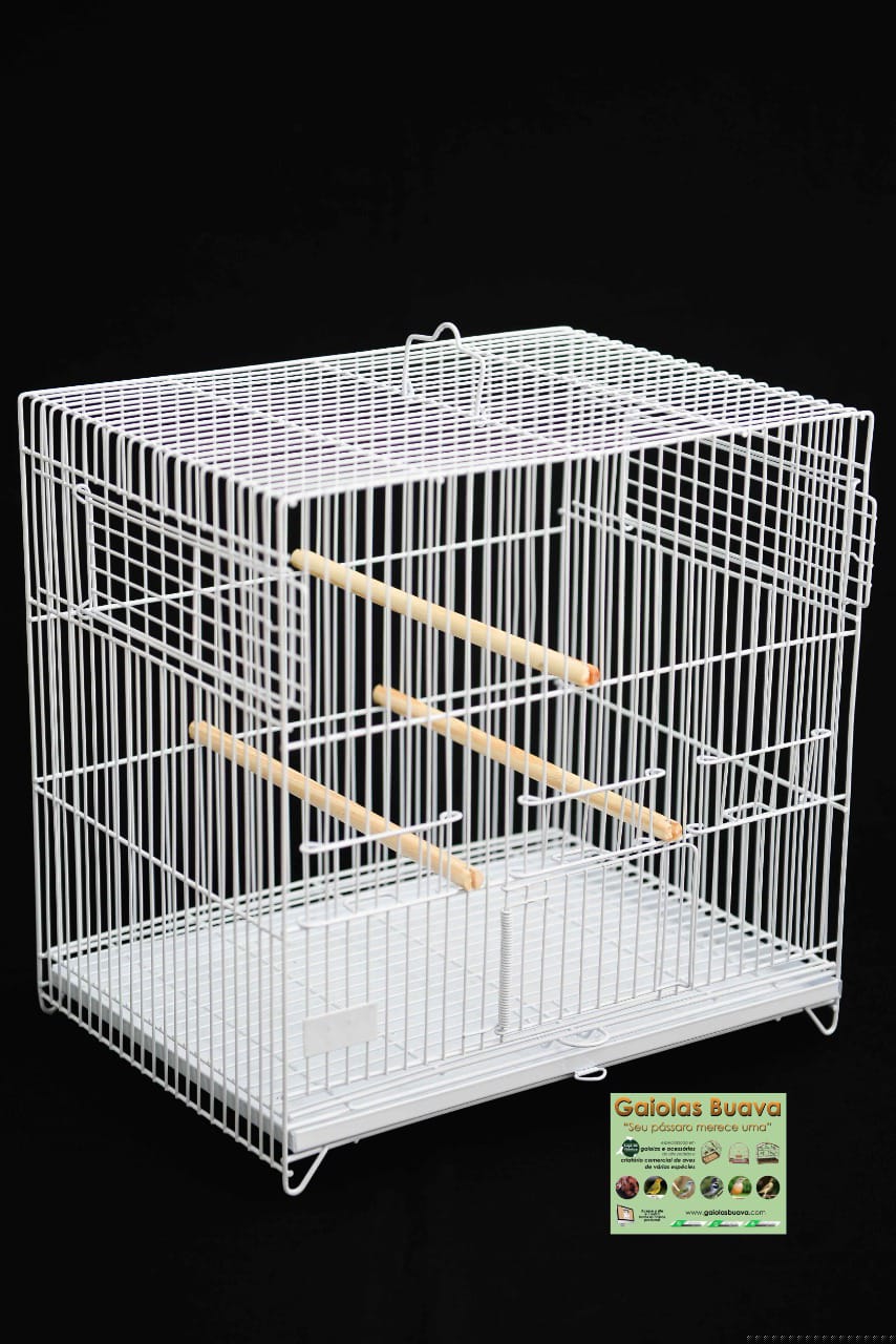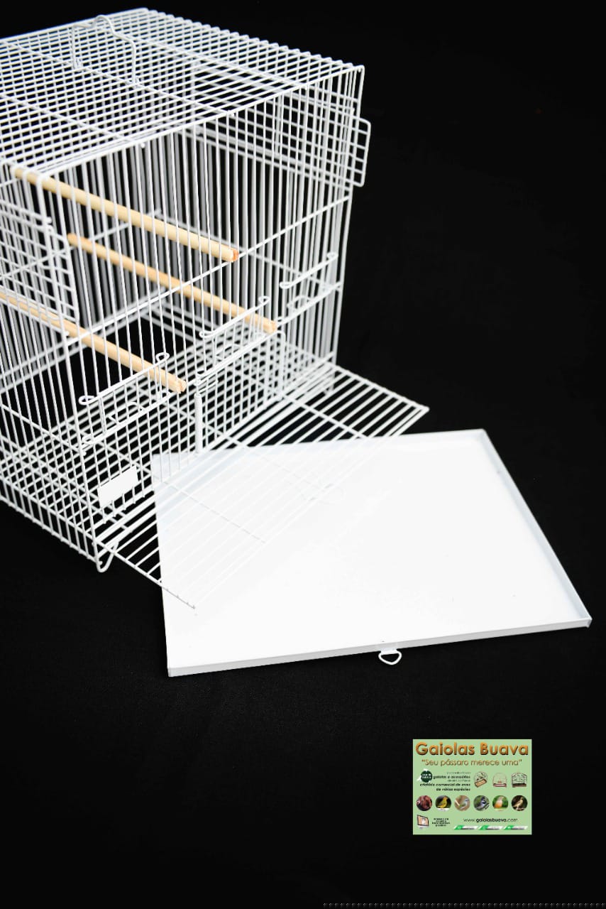 Galador de malha extra fina com pintura epoxy para pássaros como coleiro, ou outros do mesmo porte. Com dois passadores laterais, e uma porta central de mola, acompanha portinhas para os comedouros, e três poleiros.