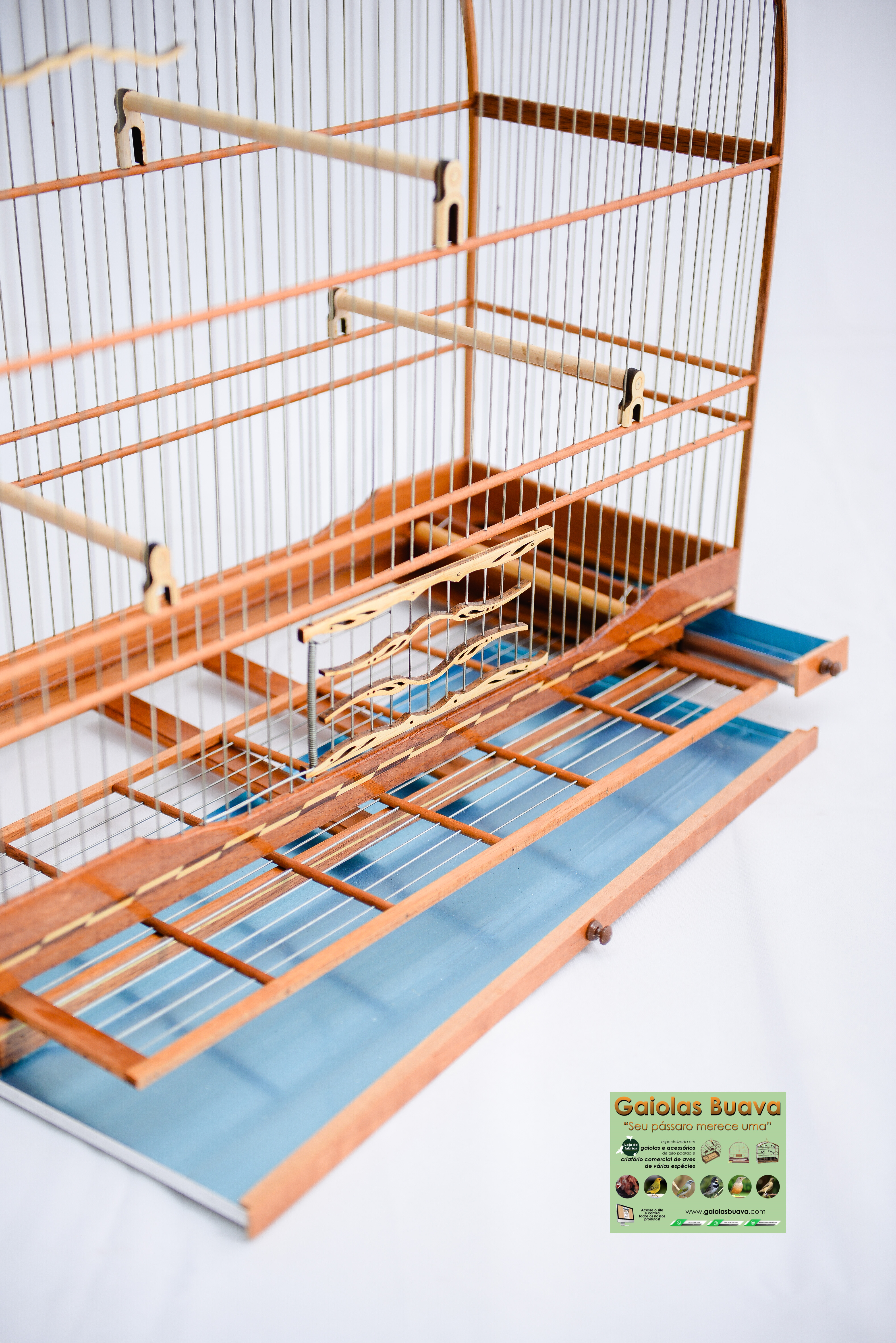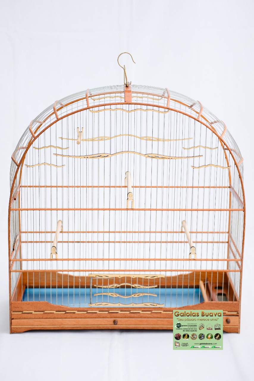 GAIOLA Nº 8 ABAULADA , FEITA EM MADEIRA NOBRE , COM GRADE REMOVÍVEL FRONTALMENTE .  COM DETALHES NA PORTA, NA FRENTE E NA PARTE TRASEIRA DA GAIOLA.