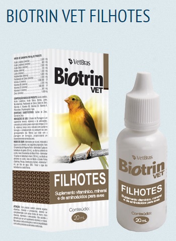 O BIOTRIN VET FILHOTES é um suplemento mineral, vitamínico e de aminoácidos, indicado para os filhotes de todas as aves domésticas e silvestres. Apresenta em sua formulação Cálcio, Vitamina D, Vitamina B12, Lisina, Colina e Metionina. O Cálcio e a Vitamina D auxiliam na formação e fortalecimento ósseo e a Lisina é um aminoácido essencial ao desenvolvimento das aves. A Colina e a Metionina proporcionam melhora da função hepática e a Vitamina B12 é essencial na formação sanguínea. Todos esses elementos juntos proporcionam um crescimento sadio das aves.