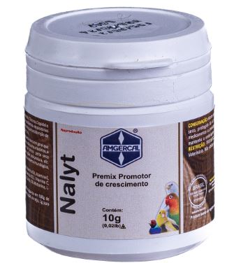 Amgercal Nalyt Reprodução é um suplemento de vitaminas, aminoácidos e eletrólitos hidrossolúvel, indicado para a fase do preparo dos reprodutores de pássaros e preparo das aves de canto. Indicado na fase anterior a colocação dos ninhos e ao início da temporada de torneios. Indicado para o uso antes da formação de casais e colocação dos ninhos. MODO DE USAR - DOSE: 10g em 500g (meio kilo) de farinhada ou ração, (1g em 50g de alimento) durante um período de 7 dias. Repetir a dose após 5 dias de repouso. Para períodos de stress ambiental, transporte, mudanças bruscas de temperatura e desgaste da cobertura, administrar o produto durante 3 dias seguidos. INDICAÇÃO: Auxilia na prevenção e controle de Mycoplasmose, Infecções Bacterianas, Coccidiose que interferem no futuro da fase de reprodução. Atua contra as causas da infertilidade dos machos, de ovos brancos, não galados, da mortalidade do embrião na bicagem do ovo e na Doença Crônica Respiratória, principal agente causador do peito seco nos machos reprodutores. É fundamental na fase de quarentena e preparo dos reprodutores. Indicado para pássaros e aves em geral que irão entrar em reprodução, que chegaram de campeonatos ou de outros criatórios, e aves submetidas à situações de desafio e condições de stress: peito seco (Mycoplasmose, Coccidiose), enterites, transportes, vacinações pré-postura, etc. Auxilia na prevenção da Salmonelose, Colibacilose e estimula o sistema imunológico, associado a nutrientes em doses próprias para esta fase. ATENÇÃO: Antes de utilizar qualquer medicamento veterinário sempre leia as instruções que acompanham o produto (bula ou rótulo). Informações sujeitas a divergências entre rótulo ou bula e este conteúdo. Caso haja diferença entre as informações aqui apresentadas e rótulo ou bula, prevalecerá sempre a informação do rótulo ou bula que acompanha o produto. Sempre leia a bula antes de utilizá-lo. Consulte sempre um médico veterinário!