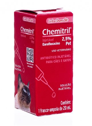 O Antibiótico Chemitril® Injetável 2,5% é indicado para cães, gatos e suínos no tratamento de infecções causadas por bactérias Gram-positivas e Gram-negativas sensíveis ao enrofloxacino. Este princípio ativo é versátil e amplamente utilizado na Medicina Veterinária como uma opção avançada de terapia medicamentosa. Este princípio ativo é do grupo das quinolonas e tem amplo espectro de ação.