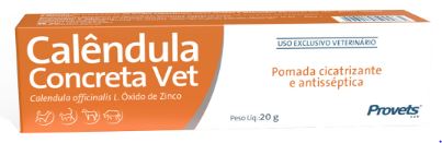Indicações complementares: Também é indicado no tratamento de queimaduras, escaras e úlceras de decúbito; contusões, pisaduras e cortes acidentais ou cirúrgicos. Fórmula: Cada 100 g contém: Tintura de Calêndula Concreta, Calendula officinalis L. ........................................ 14,46 mL Óxido de zinco ...................................................................................................... 13,30 g Excipientes q.s.p. ................................................................................................ 100,00 g Modo de usar e posologia: Uso exclusivamente externo e tópico. Aplicar uma camada de Calêndula Concreta Vet sobre as áreas afetadas, 1 a 2 vezes ao dia. Evitar o contato com a mucosa ocular.