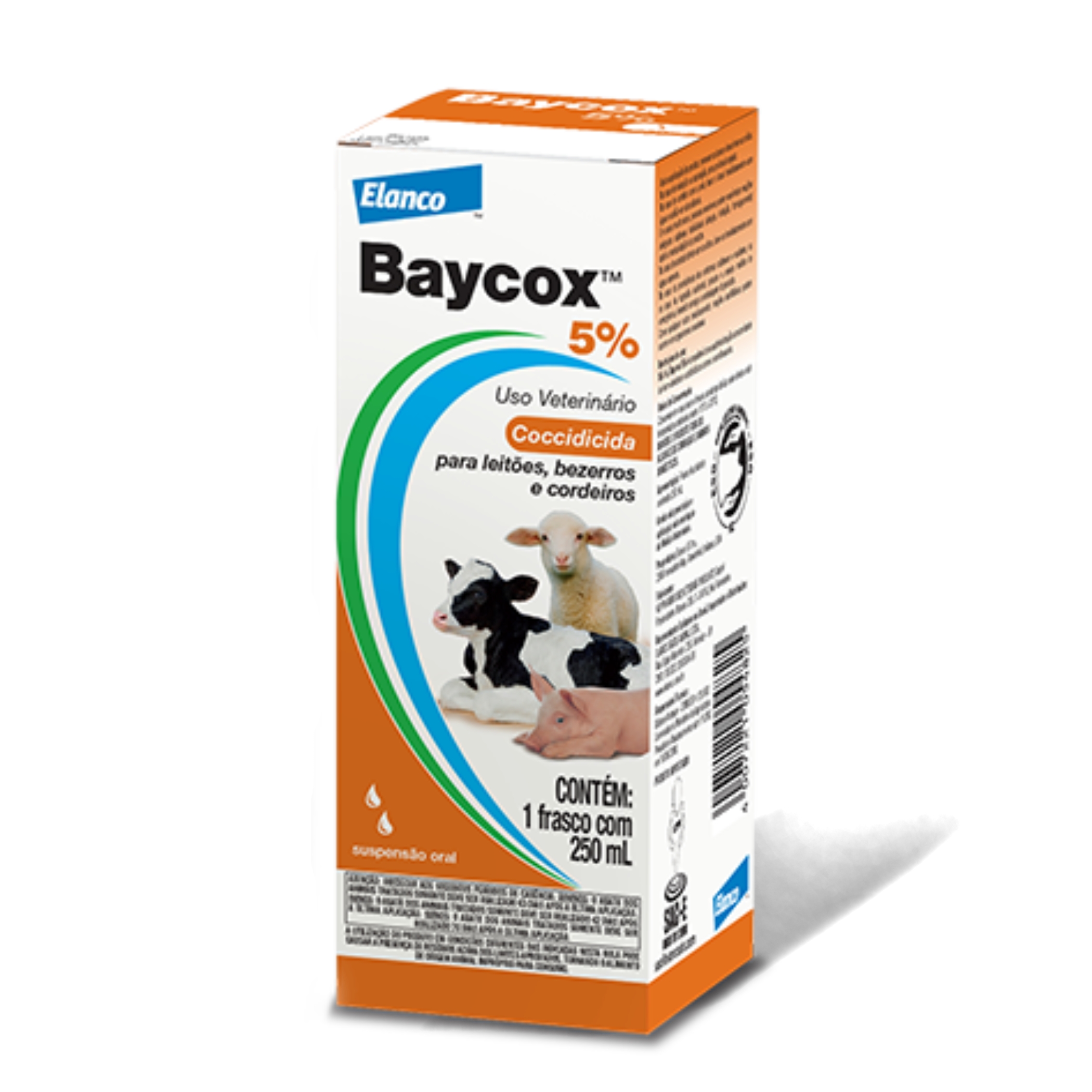 Baycox 5% da Elanco com dosador, indicado para animais de fazenda como leitões, bezerros e cordeiros. Na embalagem contém 1 frasco com 100 ml.