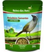 BOIADEIRO SEMENTE Alimento Completo e Balanceado para Trinca-Ferro. COMPOSIÇÃO BÁSICA: Sementes em Grãos (alpiste,senha,coriandro(mín.1%)), Cártamo, Girassol sem Casca, Girassol Miúdo, Níger, Perilla,Trigo em Grão, Arroz Cateto, Trigo Mourisco, Zimbro(mín 0,08%), Chia (min 1%), Milho Moido*,Ovo em Pó, Farelo de Arroz, Farelo de Soja*, Óleo de Soja*, Cloreto de Sódio, Farinha de Ostras, Sacarina Sódica, Neoespiridina, Dióxido de Silício, Aditivo Antifúngico(0,01%- Mistura dos Ácidos Propiônico,Acético, Fórmico e Sórbico), Aditivo Antioxidante(B.H.T), Aditivo Pigmentante (Amarelo Tartrazina, Amarelo Crepúsculo), Aroma de Mel. *ESPÉCIEIS DOADORAS DE GENES: