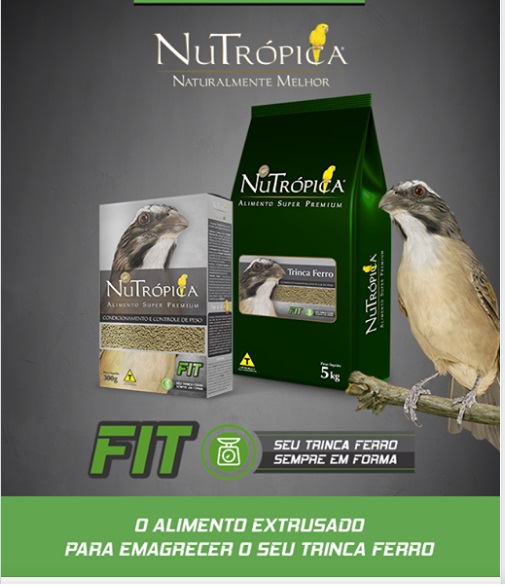 NUTRÓPICA® TRINCA FERRO FIT – EMBALAGENS DE 300G, 1KG E 5KGIndicação do produto: NuTrópica® Trinca Ferro FIT é um alimento extrusado completo, especialmente desenvolvido para o controle de peso e o correto condicionamento dessas aves durante o período de descanso entre as temporadas. Sua fórmula exclusiva, com reduzido nível calórico e maior concentração de fibras, proporciona a perda gradual e segura do sobrepeso ganho durante o período de competições e reprodução. A recuperação da condição física na pré-temporada é essencial para a performance nas rodas e para o ótimo desempenho reprodutivo. NuTrópica® Trinca Ferro FIT também é indicado para os Trinca Ferros que se exercitam pouco e que apresentam tendência ao ganho de peso excessivo. Recomendação de Consumo: NuTrópica® Trinca Ferro FIT deve ser o único alimento oferecido durante toda a pré-temporada (período que vai desde o final da temporada, inclui a muda de penas e se estende até um mês antes do próximo período de torneios ou de reprodução). NuTrópica® Trinca Ferro FIT é um alimento completo que atende a 100% das necessidades nutricionais de sua ave. Não recomendamos a adição de qualquer suplemento nutricional nem a utilização de misturas de sementes ou farinhadas. NuTrópica® Trinca Ferro FIT deve sempre estar à disposição de sua ave, assim como água limpa e fresca. Verduras e legumes frescos podem ser oferecidos, desde que não ultrapassem 20% do peso total do alimento diário. O veterinário deve ser visitado regularmente. Veja porque NuTrópica® Trinca Ferro FIT é o melhor alimento para o seu Trinca Ferro: Manutenção e Controle de Peso – NuTrópica® Trinca Ferro FIT proporciona a perda gradual e segura do sobrepeso ganho durante o período de competições e de reprodução. Ele também é indicado para os Trinca Ferros que se exercitam pouco e que apresentam tendência ao ganho de peso excessivo. Condicionamento Físico na Pré-Temporada – A fórmula exclusiva de NuTrópica® Trinca Ferro FIT, com reduzido nível calórico e maior concentração de fibras, permite um melhor condicionamento do seu Trinca Ferro durante a pré-temporada. Resistência e Desempenho Reprodutivo - A recuperação da condição física na pré-temporada é essencial para a performance nas rodas e para o ótimo desempenho reprodutivo do seu trinca ferro. Pioneirismo e Tradição - Há cerca de 20 anos, somos pioneiros no desenvolvimento e na fabricação de alimentos Super Premium para Trinca Ferros. No nosso dia a dia, pesquisamos intensamente a nutrição dessas aves, buscando a excelência em cada detalhe. Sabemos que o seu Trinca Ferro vale muito, por isto não aceite imitações: não adianta ter o mesmo formato, tamanho e coloração, o alimento do seu Trinca Ferro tem que ser NuTrópica®! Níveis de Garantia do Produto | Umidade (máx.) | 12,00% | 120 g/kg | | Proteína bruta (mín.) | 16,00% | 160 g/kg | | Extrato Etéreo (mín.) | 3,00% | 30 g/kg | | Matéria fibrosa (máx.) | 13,00% | 130 g/kg | | Matéria mineral (máx.) | 6,00% | 60 g/kg | | Cálcio (máx.) | 0,60% | 6.000mg/kg | | Cálcio (mín.) | 0,20% | 2.000mg/kg | | Fósforo (mín.) | 0,20% | 2.000mg/kg | | Sódio (mín.) | 0,05% | 500mg/kg | | Extrato de Yucca schidigera (mín) | 0,025% | 250 mg/kg | | Frutoligossacarídeos (mín.) | 0,10% | 1.000 mg/kg | | Mananoligossacarídeos (mín. | 0,10% | 1.000mg/kg | | Bacillus subtilis (mín.) | 6,4 x 108 | UFC/kg | | Bacillus licheniformis (mín.) | 6,4 x 108 | UFC/kg |