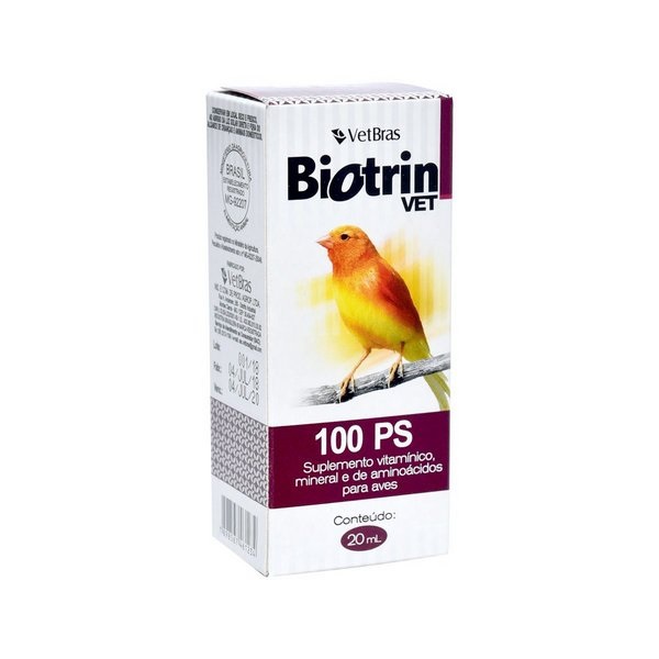 Modo de usar: Administrar o Biotrin Vet 100 PS na água de bebida nas seguintes proporções: Aves ornamentais e pássaros de menor porte (canários, curiós, etc...) Inicialmente administrar 8 gotas nos bebedouros de gaiola (50ml). A dose de manutenção é a metade da dose inicial. Pássaros de maior porte: Inicialmente administrar 16 gotas nos bebedouros de gaiola (100ml). A dose de manutenção é a metade da dose inicial. Atenção: Antes de utilizar qualquer medicamento veterinário sempre leia as instruções que acompanham o produto (bula ou rótulo). As informações aqui disponibilizadas são fornecidades pelos laboratórios no momento da inclusão do produto nesta página. Informações sujeitas a divergências entre rótulo ou bula e este contéudo. Caso haja diferença entre as informações aqui apresentadas e rótulo ou bula, prevalecerá sempre a informação do rótulo ou bula que acompanha o produto. Sempre leia a bula antes de utilizá-lo. Consulte sempre um médico veterinário!