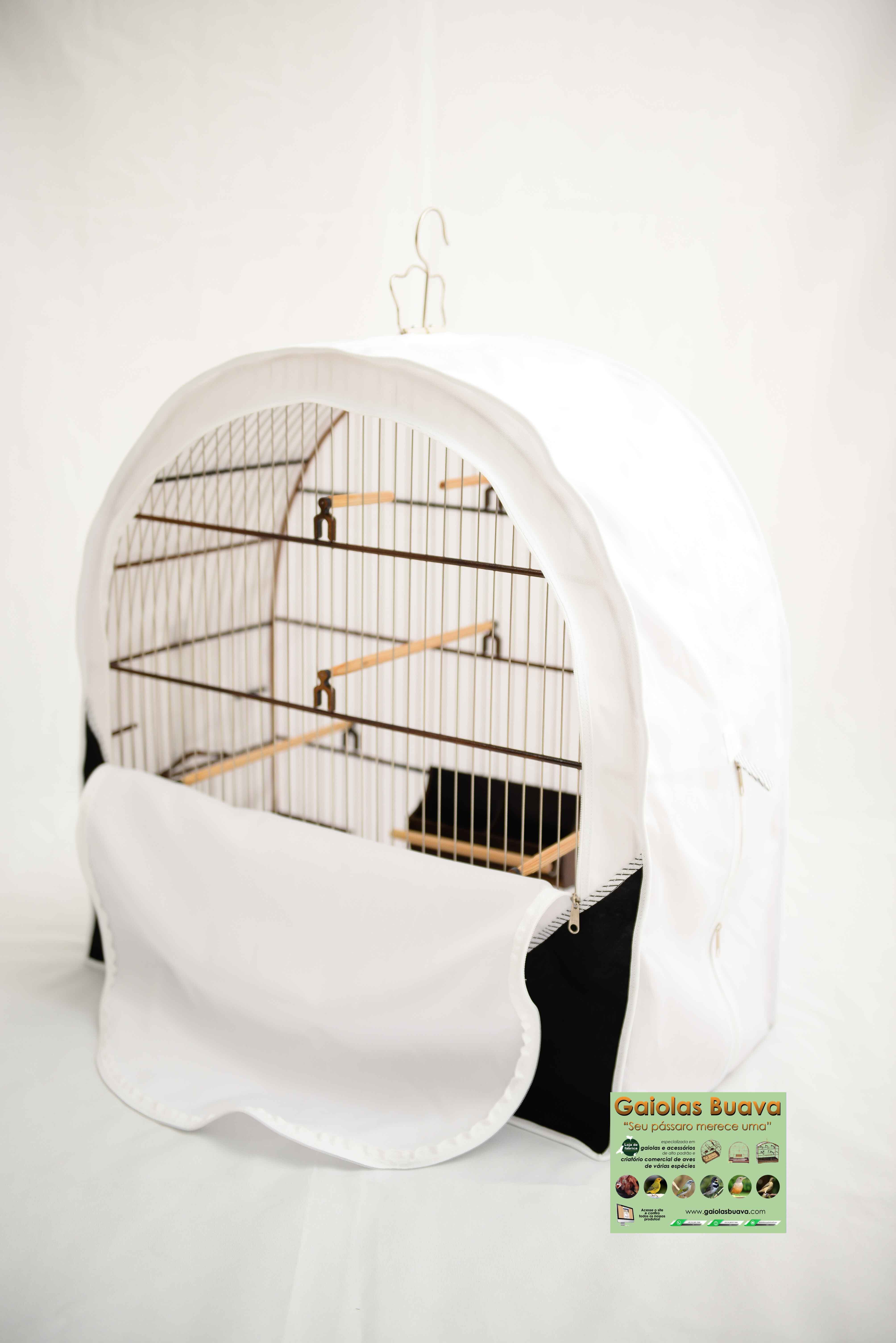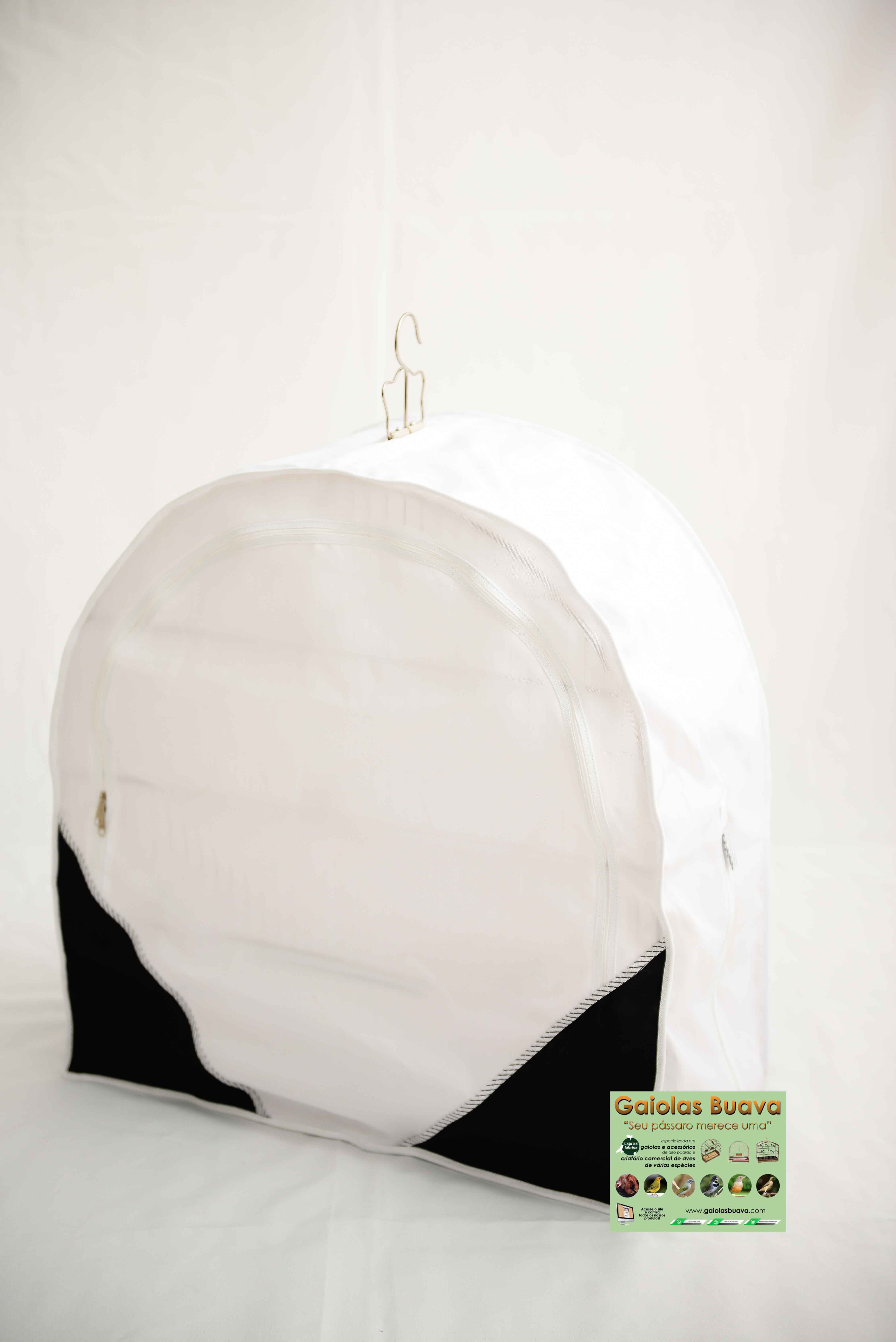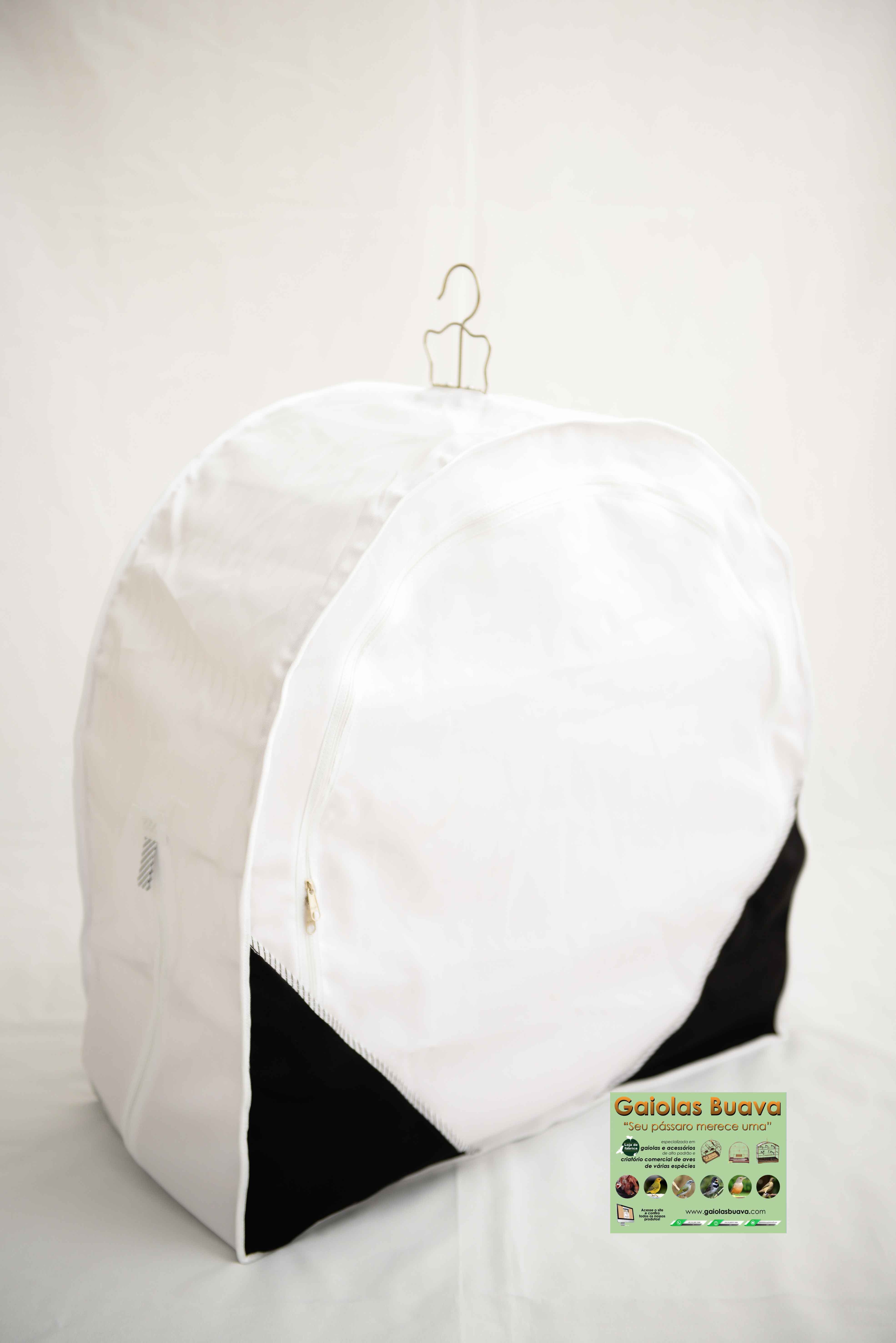 CAPA FECHADA BRANCA E PRETA Nº 61 ABERTURA EM CIMA PARA O GANCHO 1 ABERTURA TRASEIRA PARA O PREGO - PENDURAR A GAIOLA 1 ZÍPER NA PARTE INFERIOR 1 ZÍPER NA FRONTAL