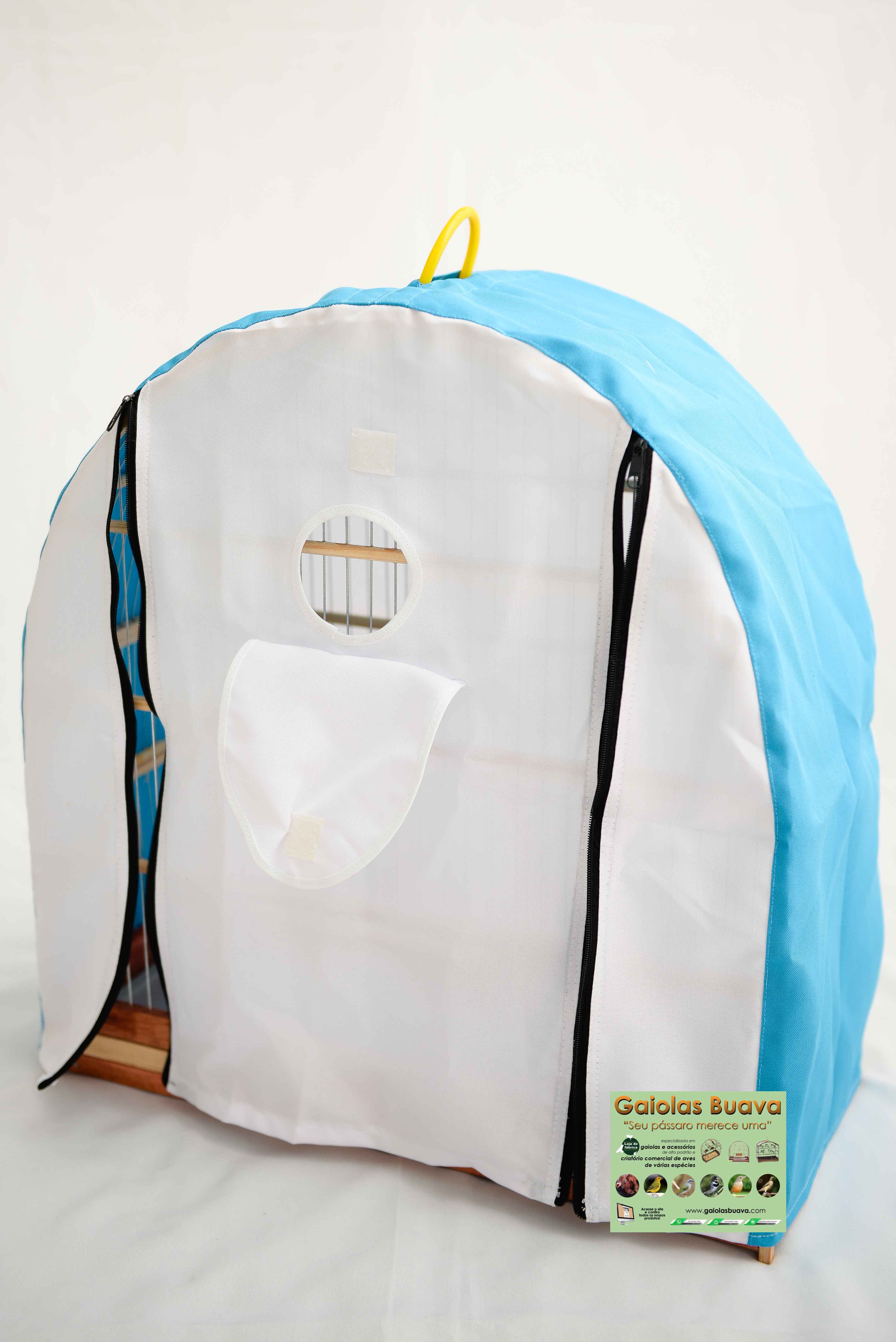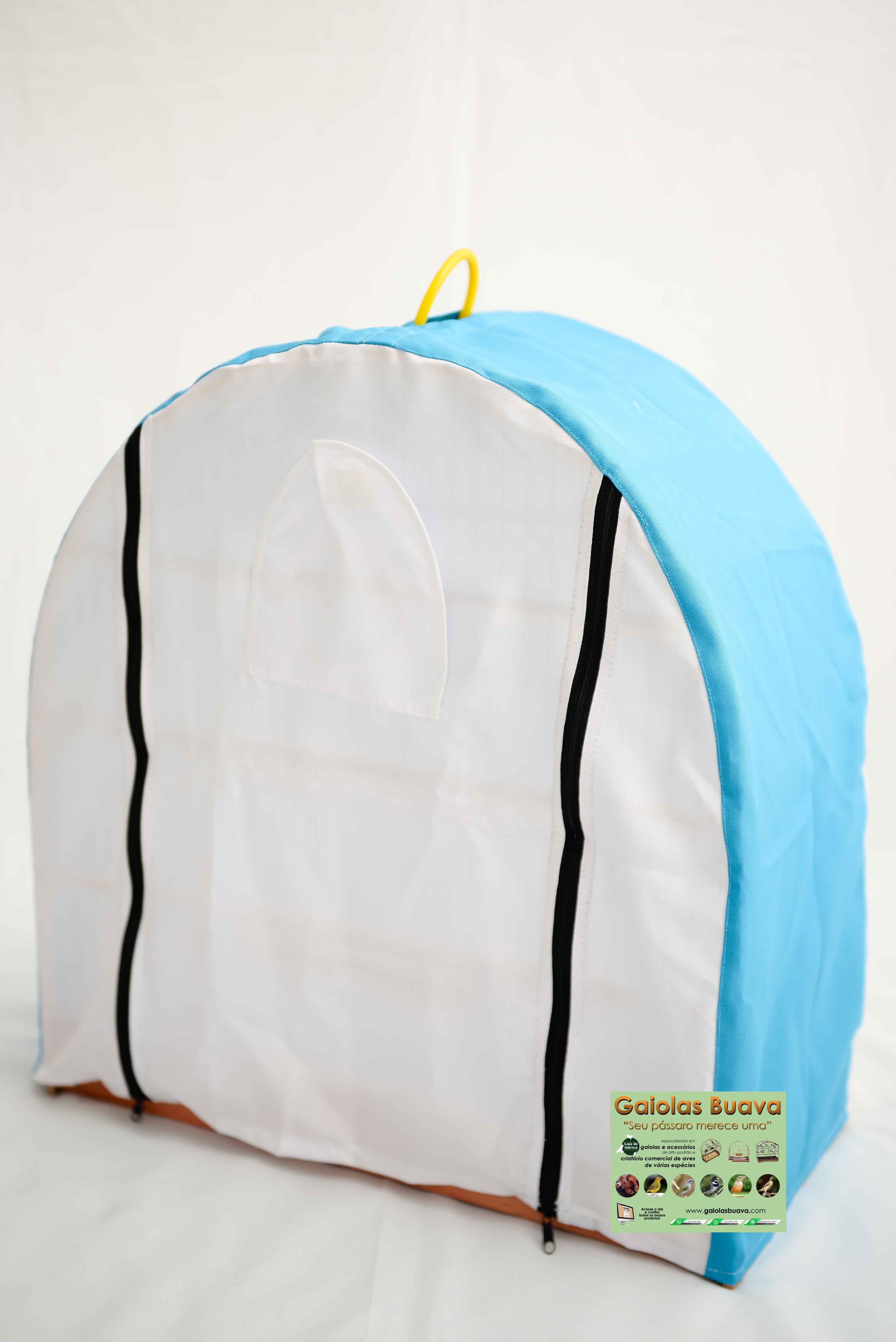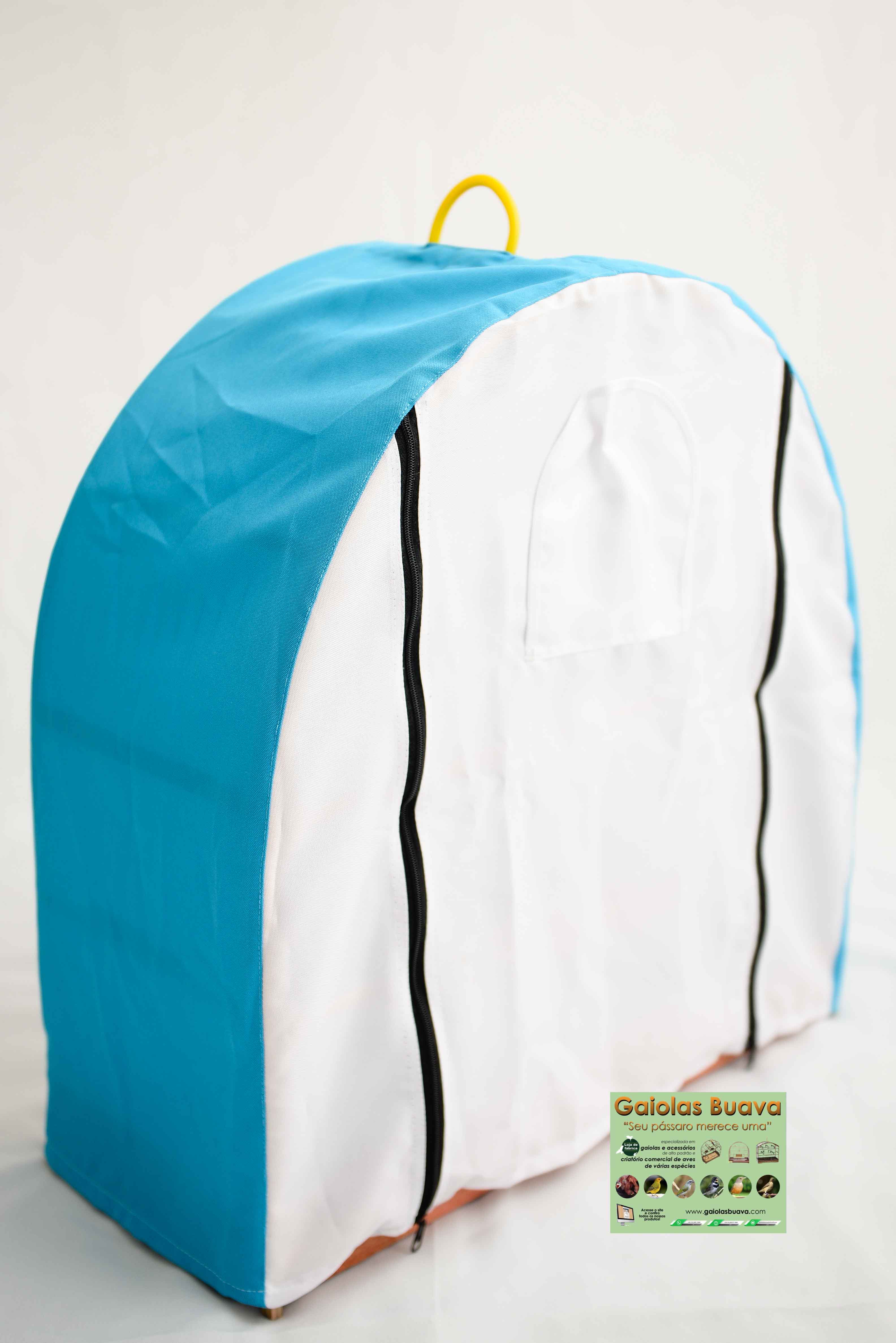 CAPA Nº 4 BRANCA E AZUL COM JANELA CENTRAL CIRCULAR 2 ZÍPERES NA FRONTAL 1 ABERTURA EM CIMA PARA O GANCHO 1 ABERTURA TRASEIRA PARA O PREGO - PENDURAR A GAIOLA