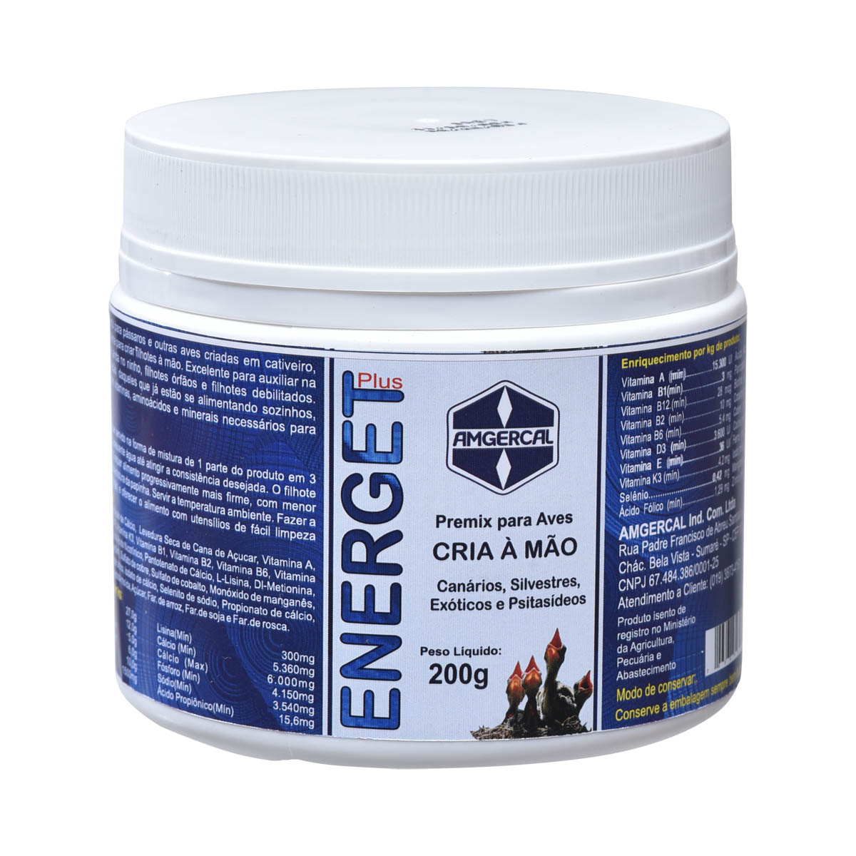 Alimentação especial para criar aves à mão, fornecendo os nutrientes e suplementos necessários à saúde e crescimento. Estimula o apetite e o desenvolvimento das aves nas fases de crescimento e de formação das penas. Auxilia na fixação da cantaxantina das aves com fator e no desenvolvimento da voz das aves canoras em fase de crescimento. Modo de usar: Dose: misture 1 parte de Energet Plus com três partes de água fria ou morna, agitando bem até atingir a consistência desejada. Evite fazer misturas com outros alimentos para evitar desbalanceamento da fórmula, porém pode ser agregada á medicações preventivas. Forneça o alimento diretamente no bico da ave usando colher de tamanho proporcional ao desenvolvimento do filhote. Renovar a mistura à cada 24 horas.