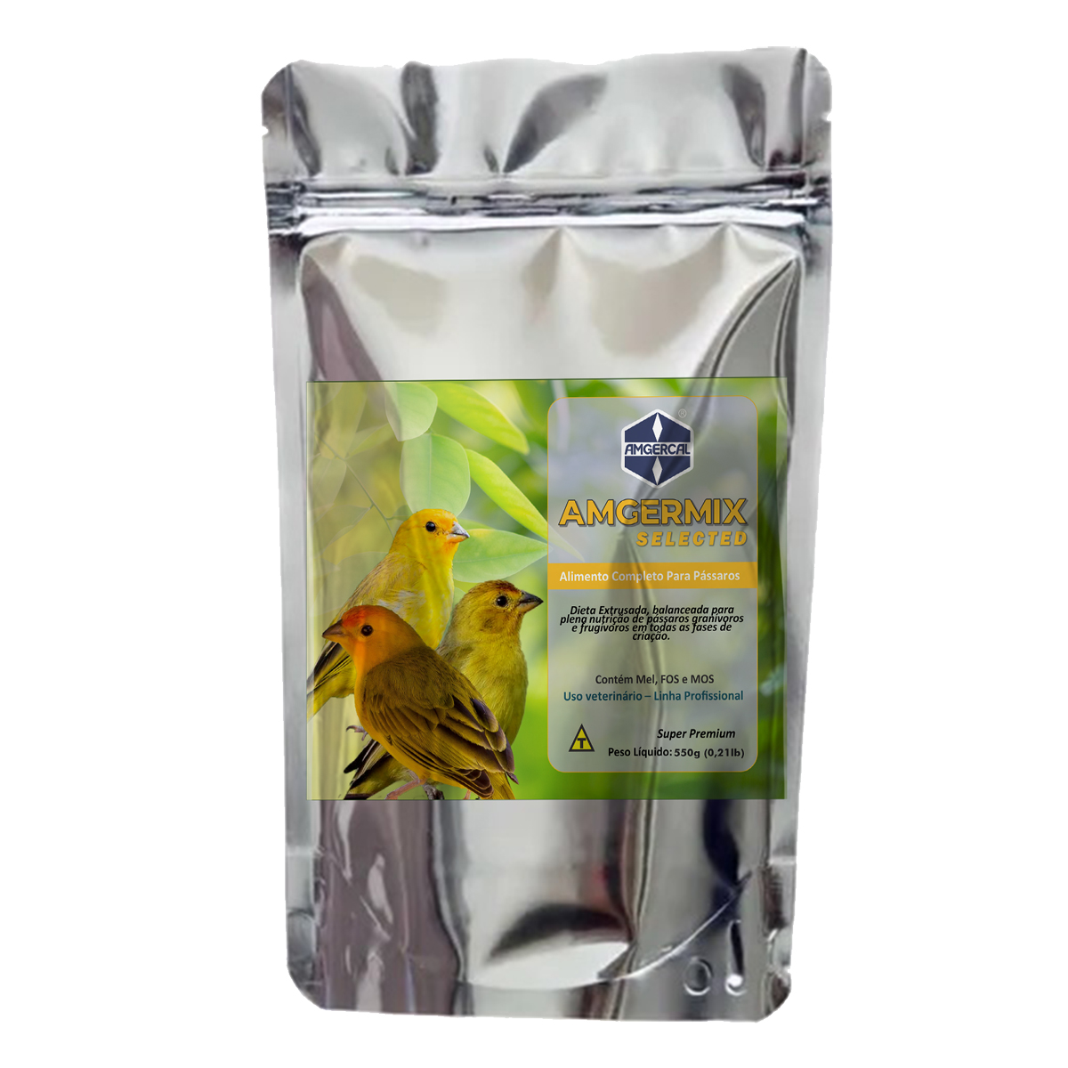 Amgermix Selected Amgercal - 550g - Foi especialmente formulada para atender as necessidades dos pássaros canoros silvestres e exóticos bem como de cor, evitando estresse e propiciando o bem estar animal