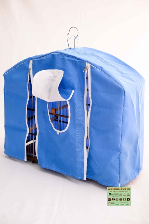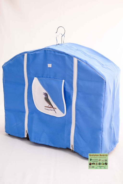 CAPA AZUL TORNEIO TRINCA-FERRO JANELA CENTRAL CIRCULAR 2 ZÍPERES NA FRONTAL 1 ABERTURA EM CIMA PARA O GANCHO 1 ABERTURA TRASEIRA PARA O PREGO - PENDURAR A GAIOLA