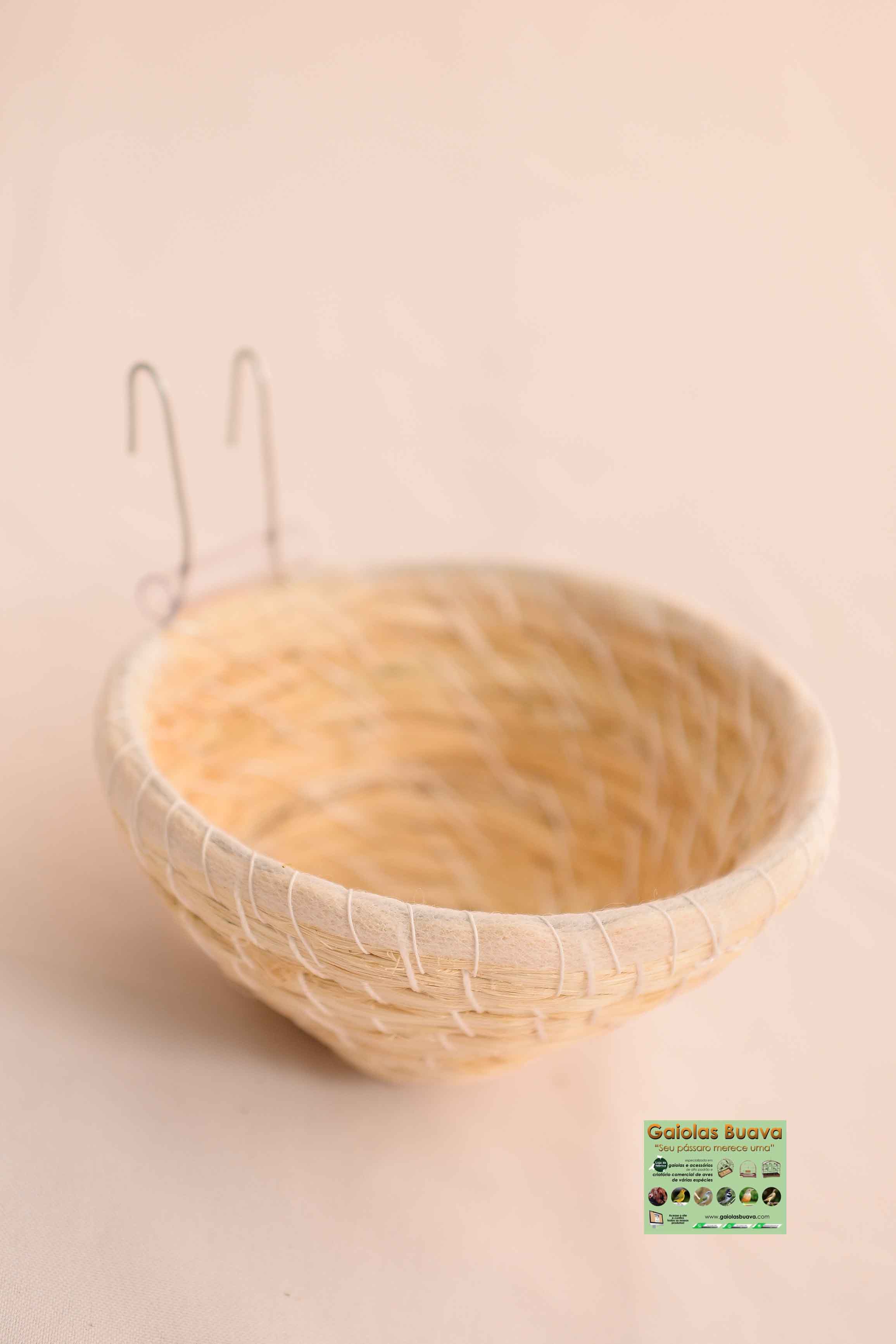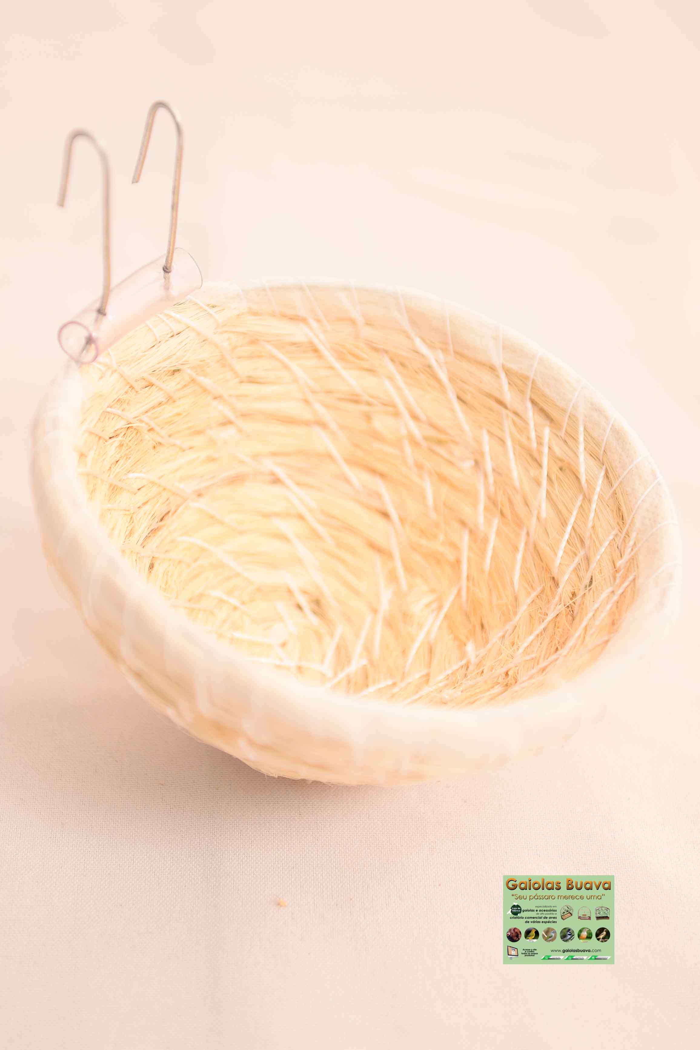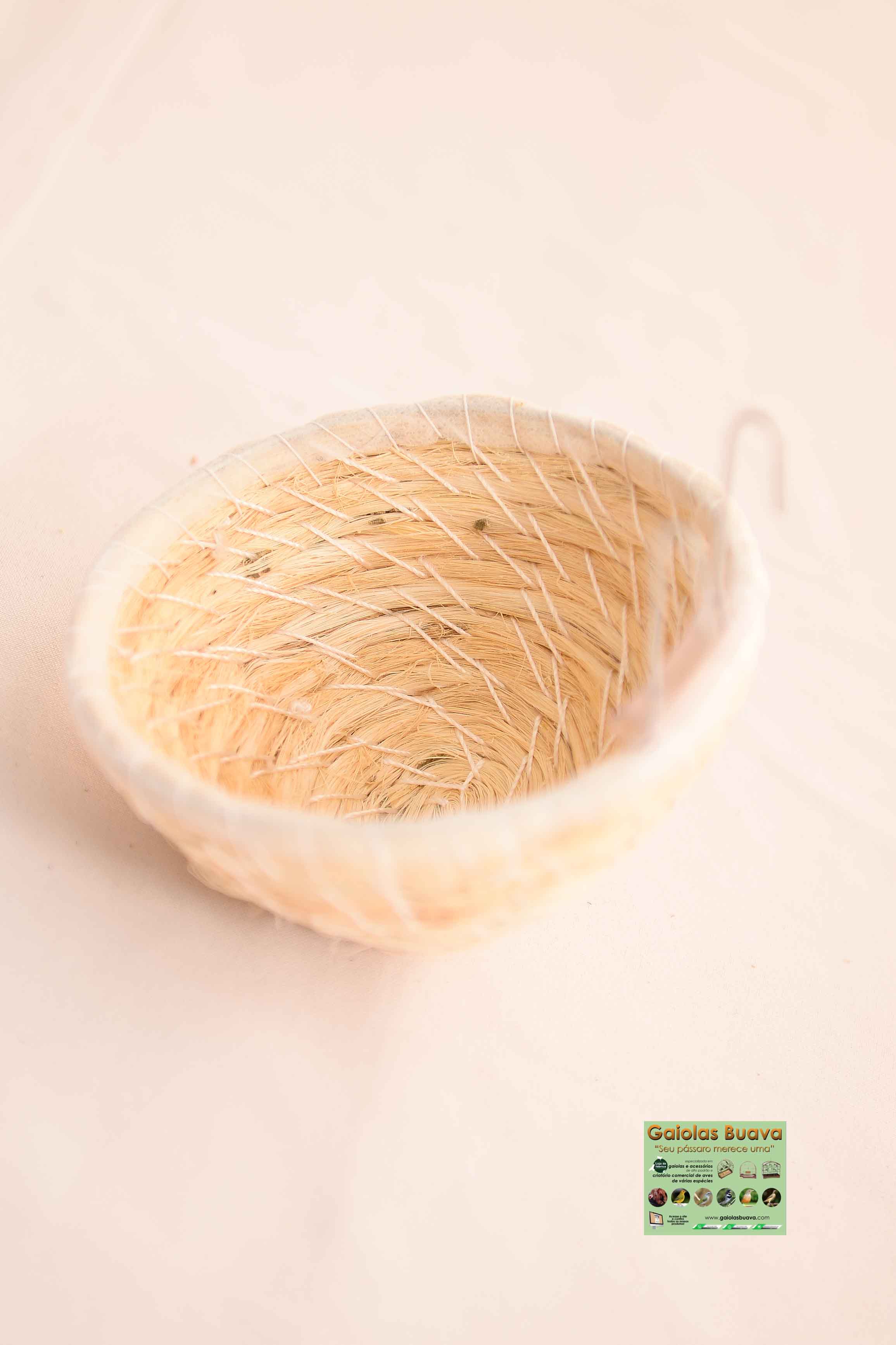 Ninho para trinca, sabia ou outros do mesmo porte, tecida em fios e fibras com ótimo acabamento. Ninho bastante resistente de fácil manejo e limpeza, acompanha uma borracha para evitar atrito a gaiola e dois ganchos para a instalação do ninho na gaiola. Além disso o ninho garante bastante conforto ao pássaro.